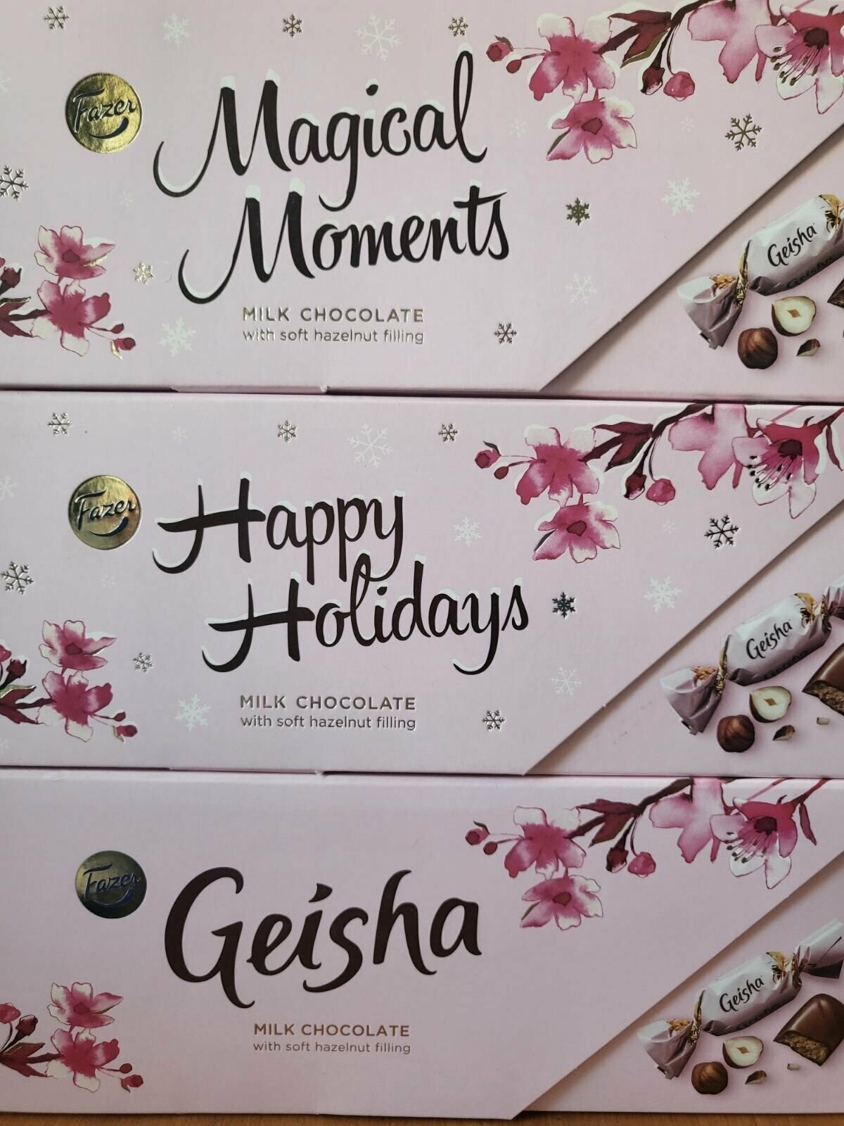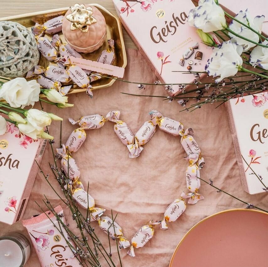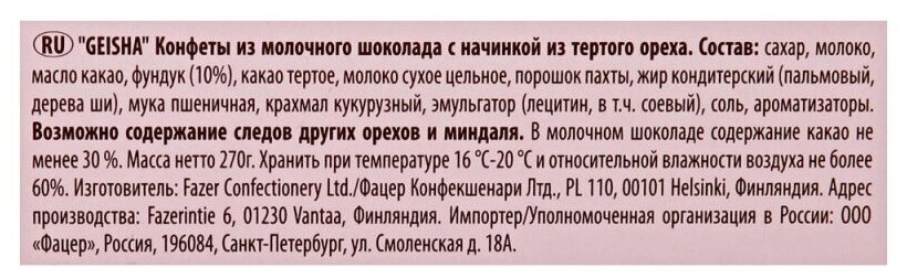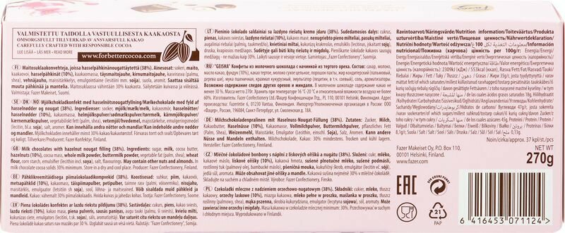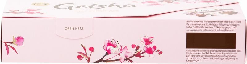 Описание товара:Шоколадные конфеты Geisha это изысканная классика – сочетание вкуса шелковистого пралине из тертого фундука в нежнейшем молочном шоколаде. Новый праздничный формат коробки в стильном европейском дизайне станет изюминкой праздничного стола и желанным подарком для тех, кто вам дорог. Конфеты произведены в Финляндии из сортов какао высочайшего качества, с использованием свежего молока, содержание фундука не менее 10%.Состав товара:Сахар, молоко, масло какао, фундук (10%), какао тертое, молоко сухое цельное, порошок пахты, жир кондитерский (пальмовый, дерева ши), мука пшеничная, крахмал кукурузный, эмульгатор (лецитин в т.ч. соевый), соль, ароматизаторы.Меры предосторожности:Возможно содержание следов орехов, миндаля и пшеницы.