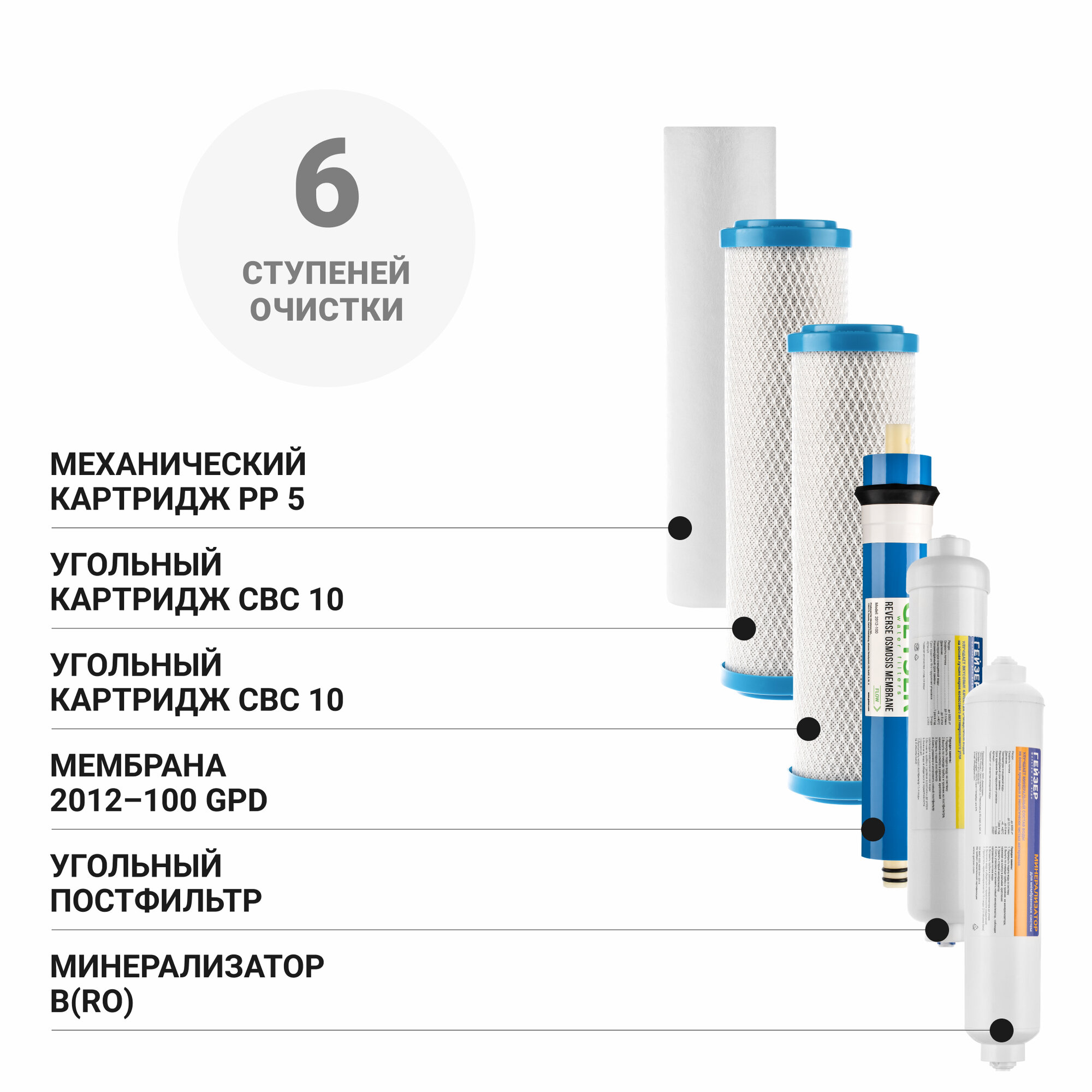 | ВКоробке | Механический фильтр – 1 шт. Угольный фильтр – 2 шт. Мембрана обратного осмоса – 1 шт. Угольный постфильтр – 1 шт. Минерализатор – 1 шт. Вентиль накопительного бака - 1 шт. Накопительный бак - 1 шт. Кран чистой воды №7 - 1 шт. Ограничитель дренажного потока - 1 шт. Обратный клапан - 1 шт. Реле высокого давления - 1 шт. Дренажный хомут - 1 компл. Тройник (адаптер) с краном подачи воды - 1 компл. Трубка JG 1/4" - 1 компл. Реле низкого давления - 1 шт. Соленоидный клапан - 1 шт. Насос (помпа) - 1 шт. Инструкция - 1 шт. |