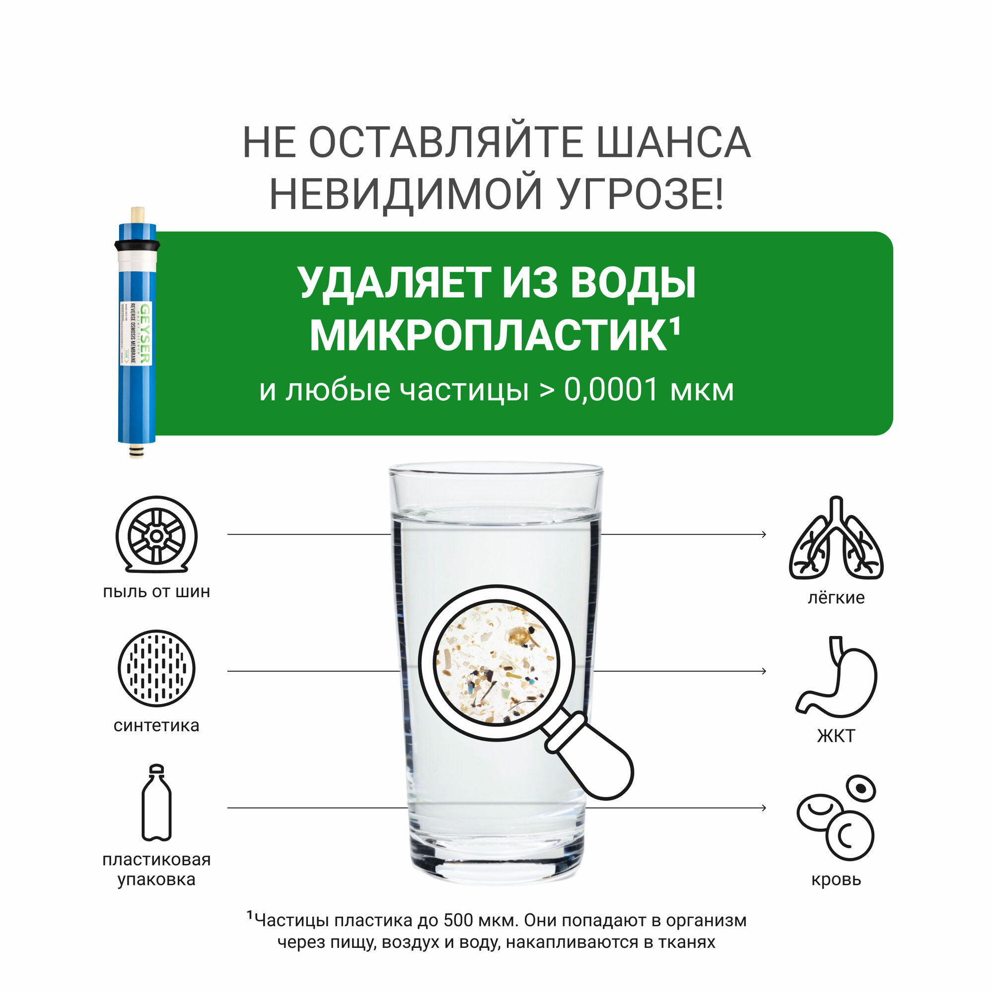 ГЕЙЗЕР — фильтр для очистки воды. Имеет подключение к водопроводу и предназначен для минерализации, обезжелезивания, смягчения воды в городских условиях, а также загородом. Работа фильтра основана на системе предварительной очистки и обратном осмосе. Скорость фильтрации — 0,15 л/мин. За сутки производит до 200 л чистой воды.