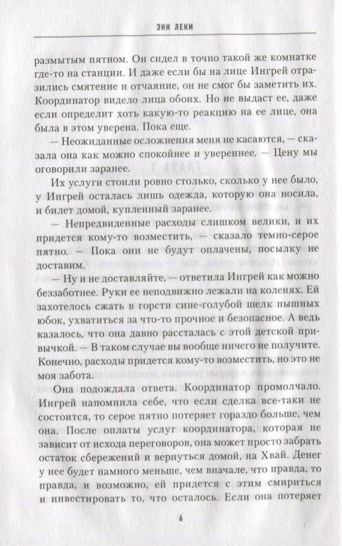 Новый роман Энн Леки о власти, привилегиях и правах, дающихся по праву рождения, возвращает нас во вселенную империи Радч. Ингрей получает единственный шанс обеспечить свою будущую карьеру и вернуть бесценные утраченные артефакты, принадлежавшие ее народу. Для этого ей нужно освободить похитителя, вытащить его с планеты-тюрьмы, откуда еще никто не возвращался. Ингрей с ее должником прилетают домой и оказываются в самом центре межгалактического конфликта, разворачивающегося на планете, раздираемой политическими интригами. Им придется выработать новый план, чтобы спасти будущее не только Ингрей, но ее семьи и мира в целом, пока оно не рассыпалось в прах.