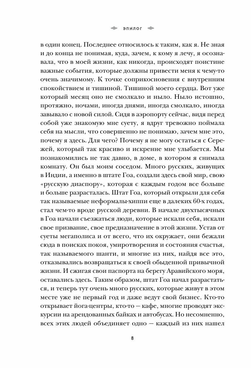 Алена пережила тяжелый развод, уволилась с работы и отправилась в путешествие по загадочной и манящей Индии в поисках ответов на свои вопросы. Автор приглашает вас в странствие полное мужчин, медитаций, шаманских обрядов и запаха карри.