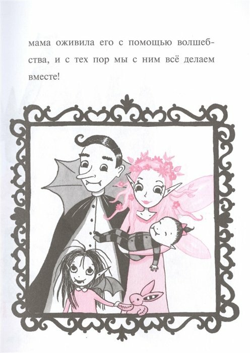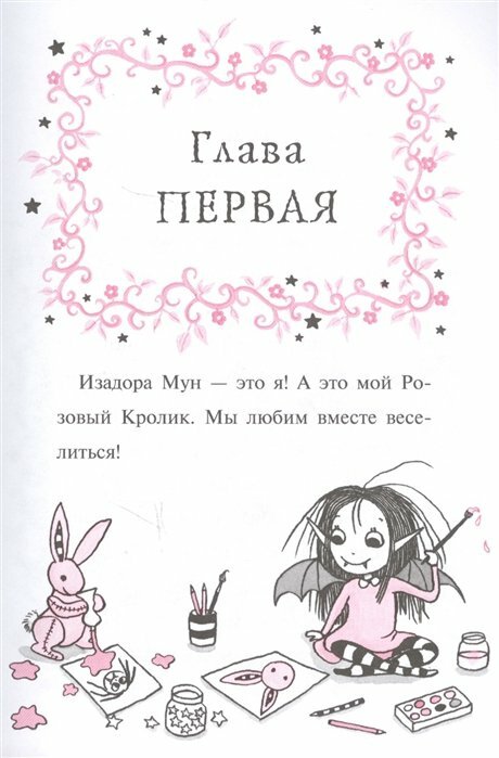 Книга современная, слог очень легкий, простой, и, что здорово, без сленга! Единственное, что смутило, это картинка, где Изадора купается в ванной в форме...гроба. Это никак не объясняется в тексте, вампирский антураж, что понятно взрослому, но в совсем детской книжке, рассчитанной на возраст от лет 5, не стоило все-таки. А так оформление очень приятное, розово-черные картинки совсем не мрачные, а создают какое-то особенное волшебное настроение.