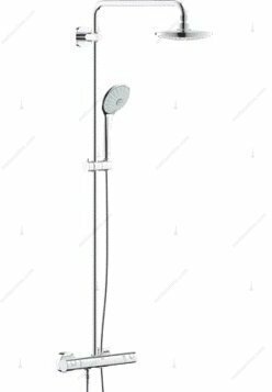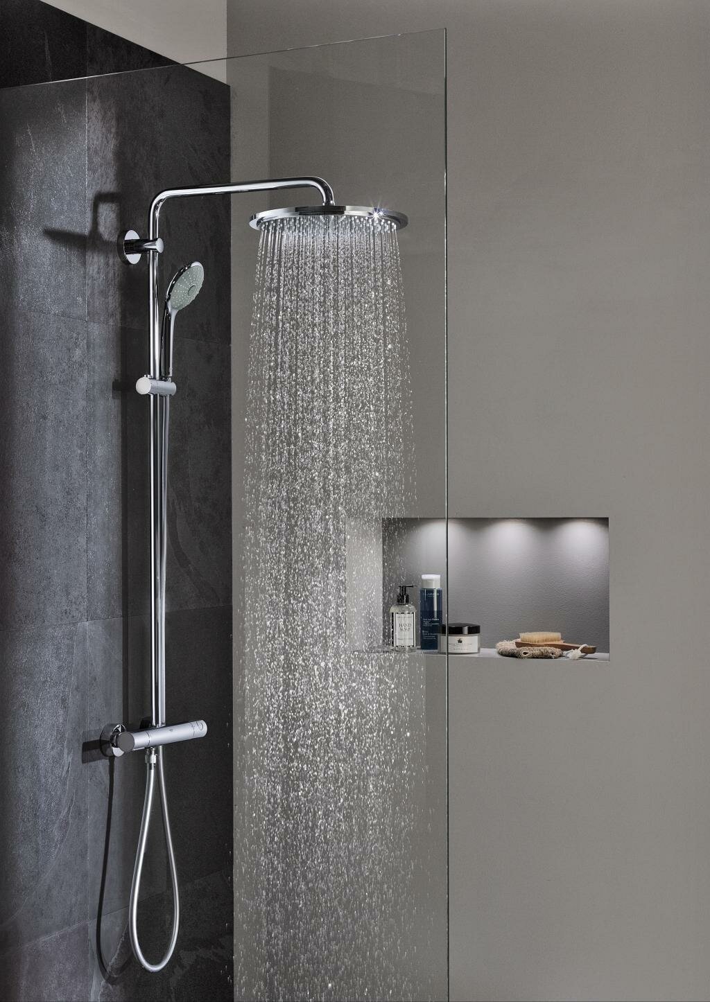 Душевая система GROHE – это: смеситель для душа со встроенным термоэлементом GROHE TurboStat®, верхний душ с режимом Rain, ручной душ с режимом Massage и скользящим креплением для удобной регулировки высоты. Монтируется на стену. Подходит для использования с проточным водонагревателем от 18 кВт.