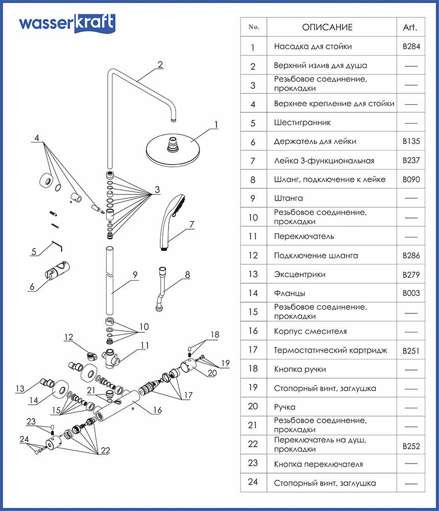 Душевая стойка WasserKRAFT Thermo. Душевой комплект с насадкой «Ливневый дождь». Входит в комплект: душевая насадка Ø 250мм, 135 форсунок, ABS-пластик, стойка для душа, Ø 25мм регулируемая по высоте, лейка 3-функциональная с системой защиты от известковых отложений, шланг металлический 1500мм, подключение к лейке, термостатический смеситель, термостатический картридж, обратные клапаны, поворотный уголок на шланг для душа, эксцентрики со встроенным фильтром, регулируемый держатель лейки, набор для монтажа