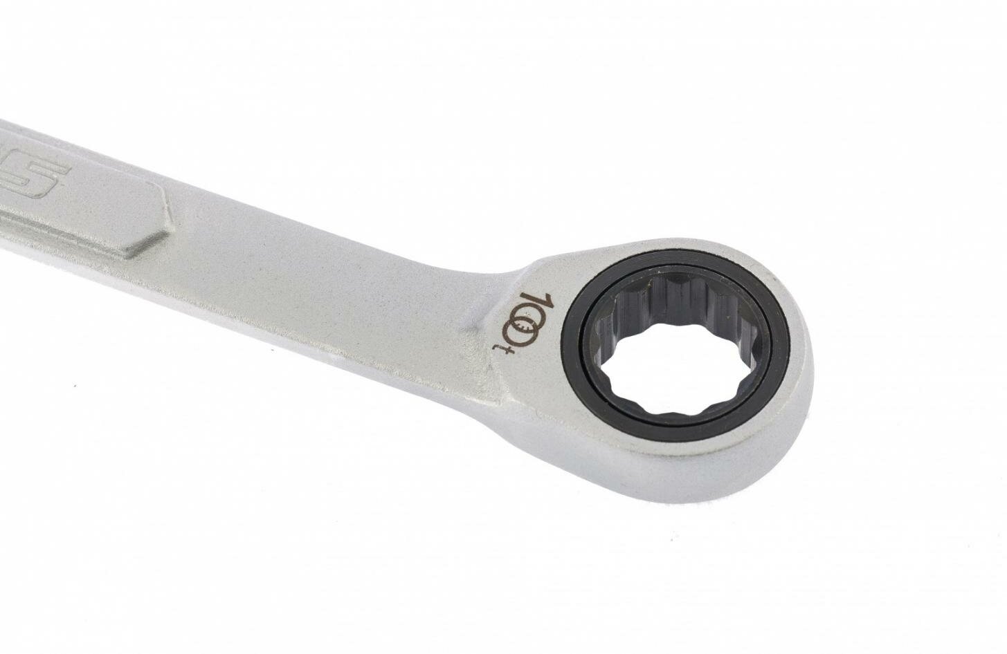 Комбинированный трещоточный ключ Gross используется при монтаже и демонтаже резьбовых соединений. Инструмент имеет как рожковую, так и накидную часть, что повышает его функциональность. У накидной части 12 внутренних граней, что увеличивает площадь соприкосновения с головкой крепежа и снижает риск ее деформации. Ключ применяется как в автосервисах, так и для самостоятельного ремонта автомобилей. Преимущества: - Инструмент изготовлен методом горячей штамповки из высококачественной стали хромованадиевой группы, что обеспечивает его устойчивость к износу и высоким нагрузкам; - Усиленная рожковая часть позволяет справляться с крепежами, требующими значительных усилий; - Благодаря матовому покрытию ключ не выскальзывает из рук, даже если они в масле; - Храповый механизм оснащен 100 зубцами, что обеспечивает плавность хода инструмента и делает его удобным для работы в ограниченном пространстве; - Инструмент соответствует немецкому стандарту DIN, что подтверждает его высокое качество и надежность. Предназначен для работы с любыми разновидностями шестигранного крепежа. Материал: сталь CrV; Размер: 16 мм.