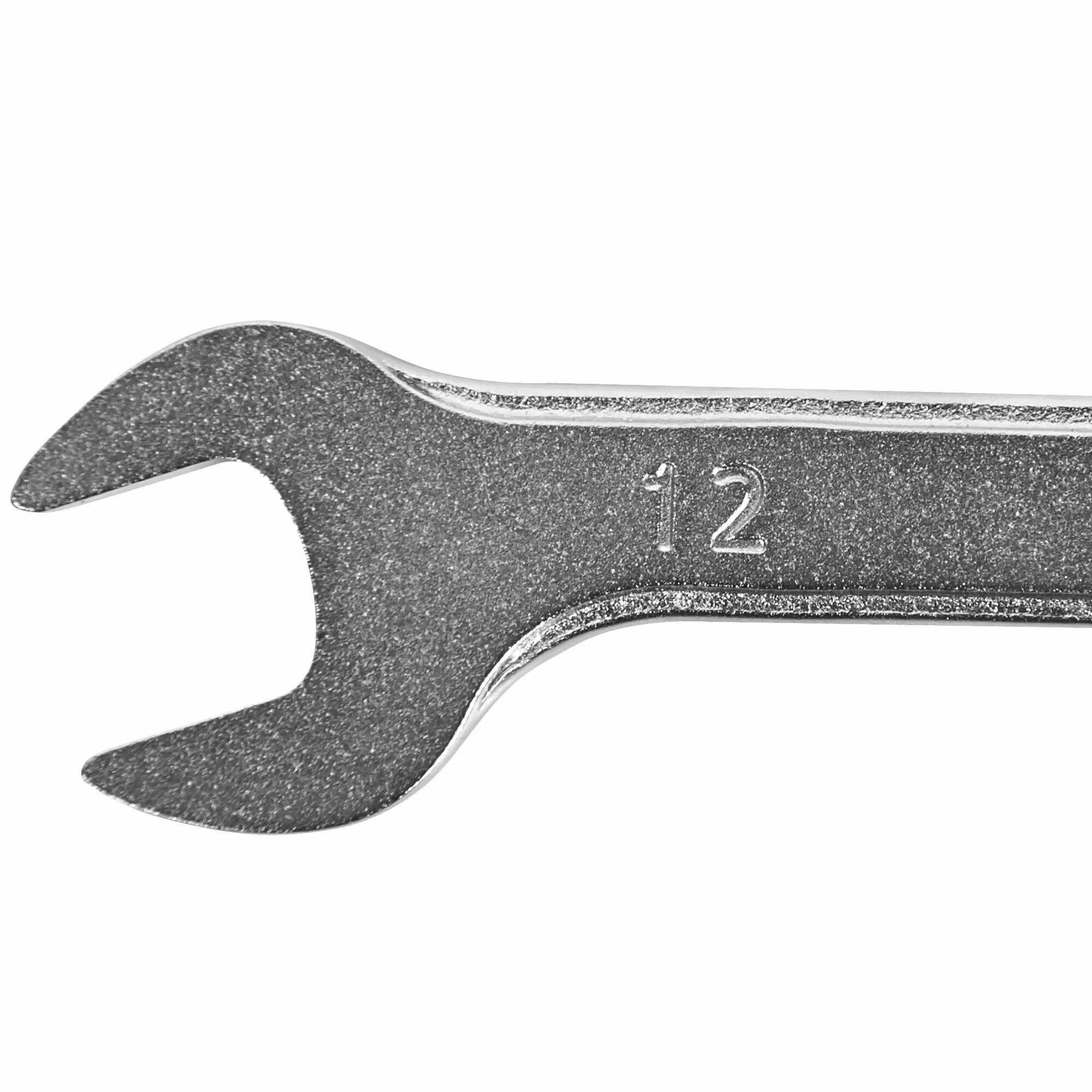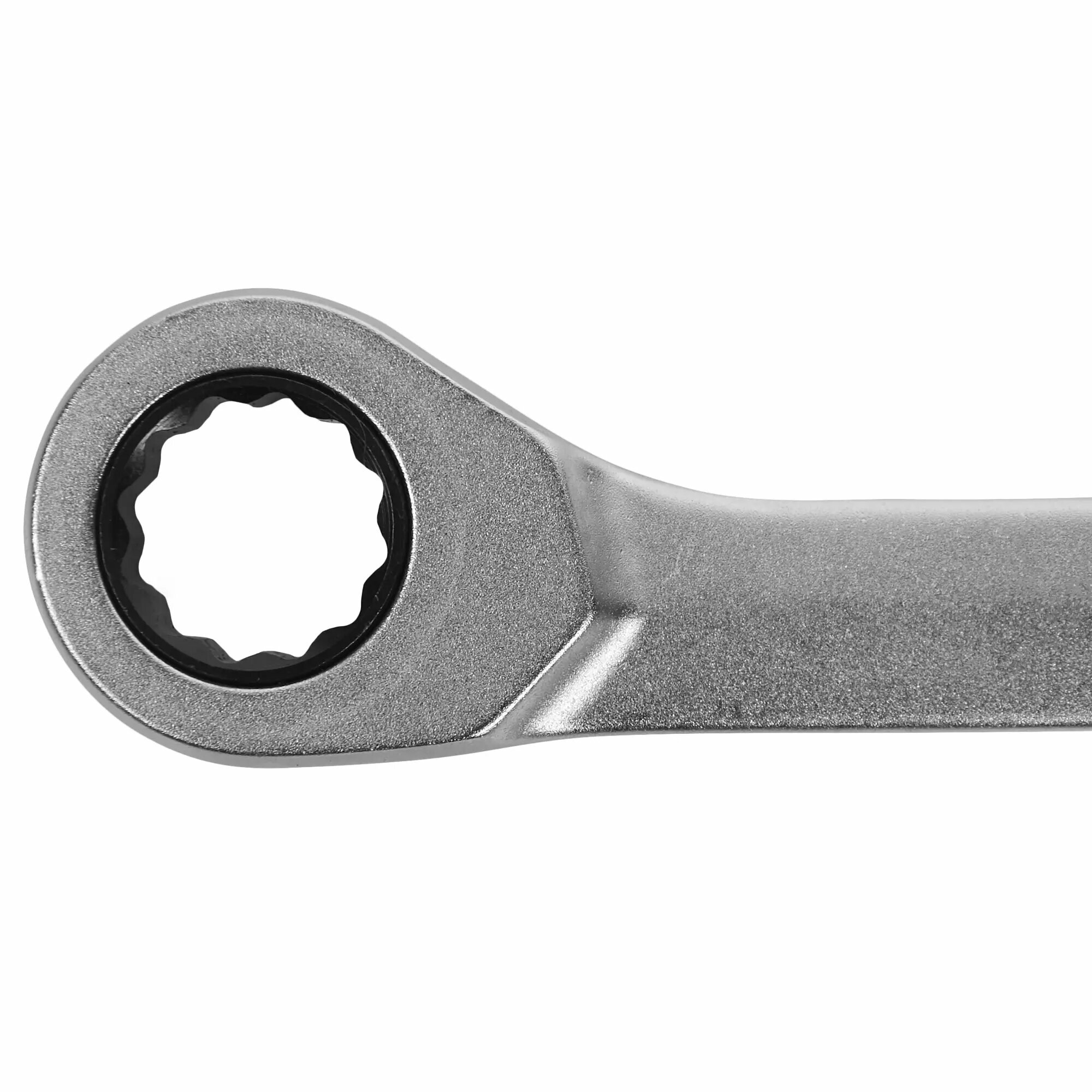 Комбинированный трещоточный ключ Gross используется при монтаже и демонтаже резьбовых соединений. Инструмент имеет как рожковую, так и накидную часть, что повышает его функциональность. У накидной части 12 внутренних граней, что увеличивает площадь соприкосновения с головкой крепежа и снижает риск ее деформации. Ключ применяется как в автосервисах, так и для самостоятельного ремонта автомобилей. Преимущества: - Инструмент изготовлен методом горячей штамповки из высококачественной стали хромованадиевой группы, что обеспечивает его устойчивость к износу и высоким нагрузкам; - Усиленная рожковая часть позволяет справляться с крепежами, требующими значительных усилий; - Благодаря матовому покрытию ключ не выскальзывает из рук, даже если они в масле; - Храповый механизм оснащен 100 зубцами, что обеспечивает плавность хода инструмента и делает его удобным для работы в ограниченном пространстве; - Инструмент соответствует немецкому стандарту DIN, что подтверждает его высокое качество и надежность. Предназначен для работы с любыми разновидностями шестигранного крепежа. Материал: хромованадиевая сталь; Размер: 12 мм.