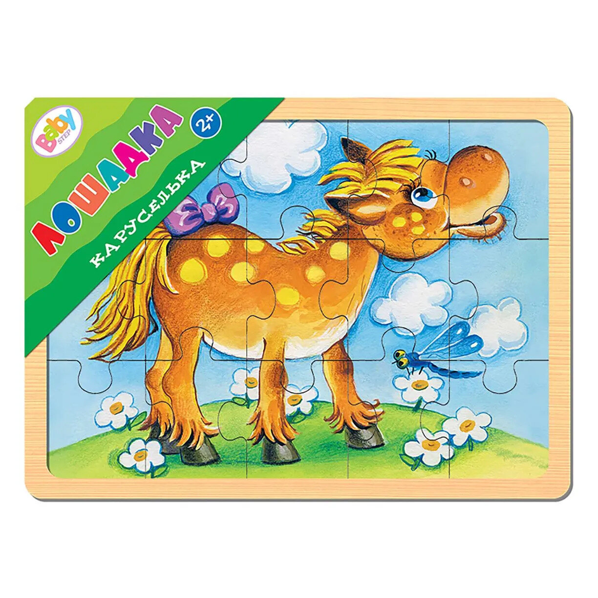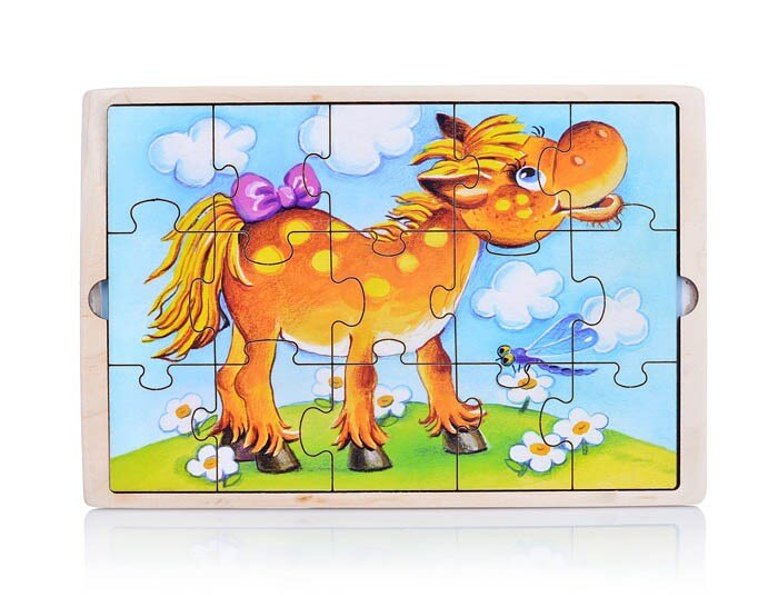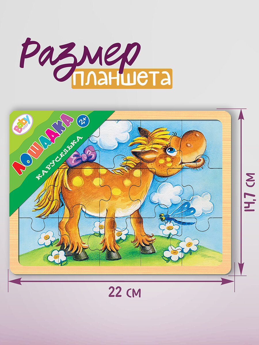 Настольная развивающая игра из дерева “Каруселька. Лошадка” - экологически чистая и безопасная игрушка. Положительно влияет на развитие мелкой моторики и сенсорное восприятие ребенка. Эта игра для тех, кто только учится собирать пазлы. Простая картинка, оригинальная вырубка, эмоционально окрашенный образ помогут достичь результата. Характеристика:размер планшета - 22 х 14,7 смразмер собранной картинки - 20 х 13,5 смразмер одной детали - 4 х 4,5 х 0,4 см (в планшете 15 пазлов-вкладышей).