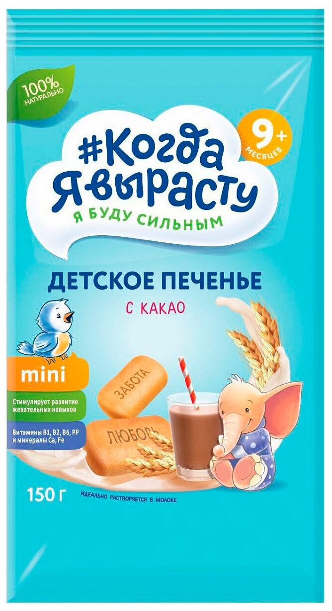 Когда Я вырасту Печенье детское с какао с витаминами и минералами с 9 мес. 150 г - это сбалансированный и полезный детский продукт питания или дополнительного прикорма для детей старше 9 месяцев. Разнообразные форматы печенья от мини-мини, которые так удобно держать маленькими детскими ручками, до стандартных, с забавными надписями на каждом из них, превратят процесс питания в развлечение! Печенье производится на новейшем современном заводе с соблюдением высоких требований к качеству детского питания. Печенье можно употреблять в сухом виде или разводить теплым молоком, чаем или водой. Для кормления растворите из расчета 3 печенья на 100 мл теплого молока (чая, воды), тщательно перемешайте и кормите из бутылочки или ложечки. Не оставляйте ребенка одного во время еды без присмотра!