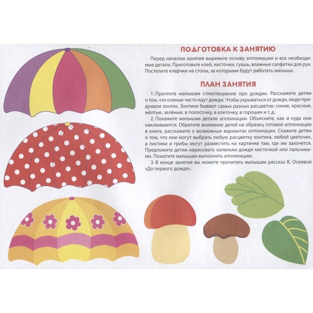 В книге - полный набор: и готовые картинки для вырезания и наклеивания, и подробная инструкция с планом занятия. Не нужно что-то придумывать самому - просто читаешь и играешь с малышом. После рабочего дня - самое то, чтобы и с мелким поиграть, и голову не ломать.