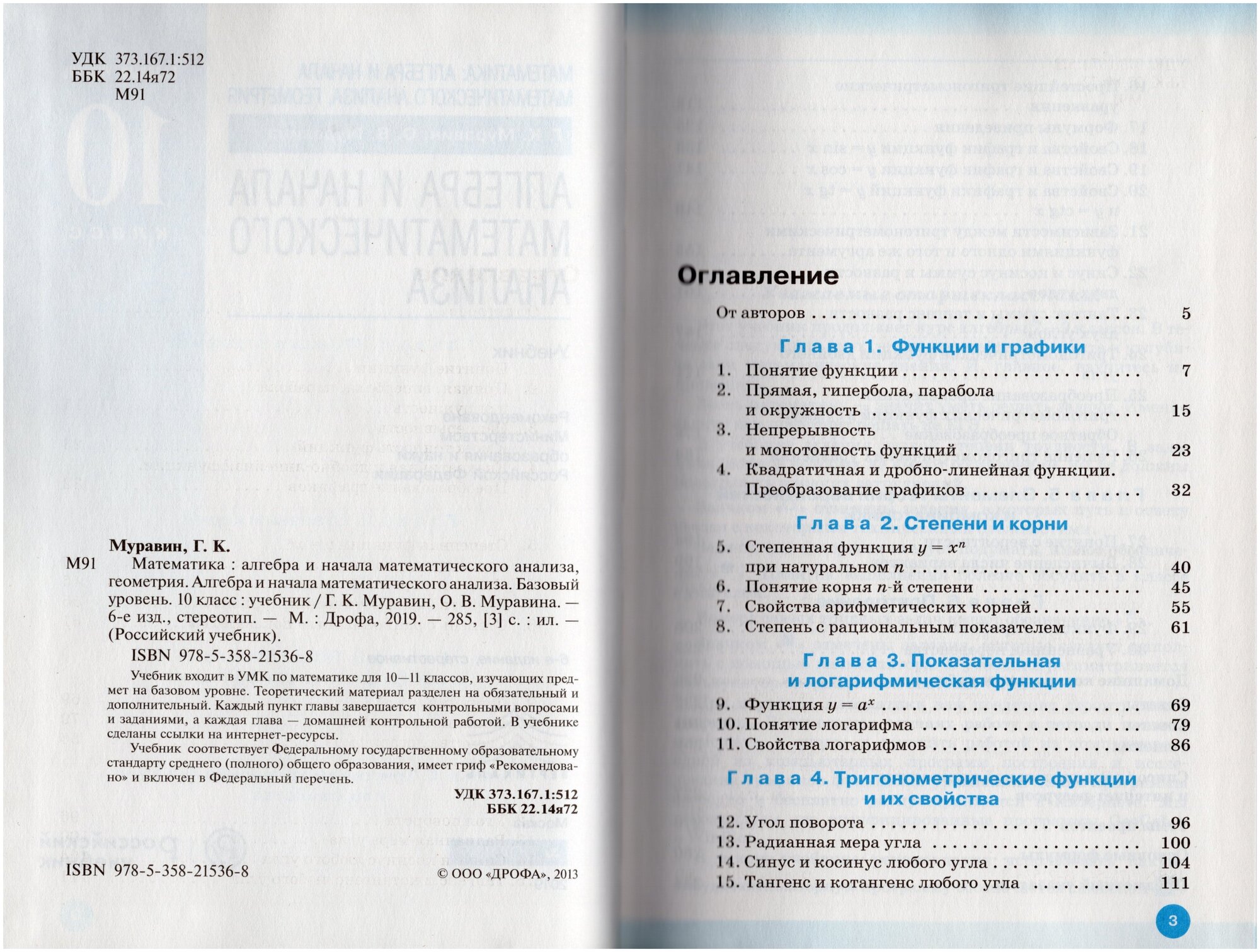 Математика: алгебра и начала математического анализа геометрия. Алгебра и начала математического анализа. Базовый уровень. 10 класс. Учебник. 6-е издание стереотипное (Ольга Викторовна Муравина, Георгий Константинович Муравин); Дрофа, 2019