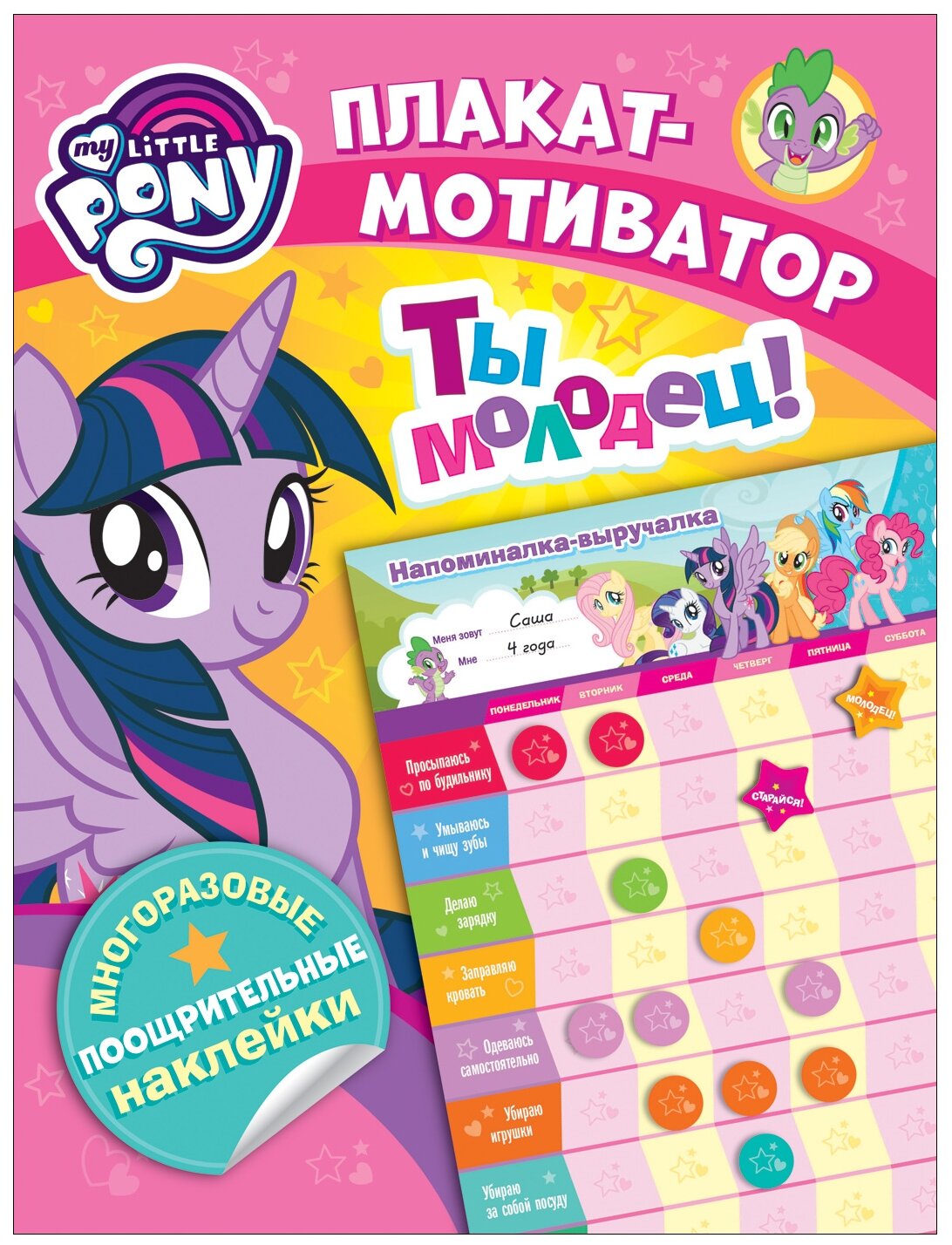 Кто проснулся по будильнику, умылся и почистил зубы, сделал зарядку и заправил кроватку? Кто слушается маму и убирает игрушки? Этот веселый и красочный плакат-мотиватор с изображениями милых пони из мультсериала «Дружба - это чудо» поможет ребенку запомнить список повседневных дел и приучиться к порядку и самостоятельности, а мамам и папам - вовремя поощрять и хвалить ребенка за маленькие, но такие важные ежедневные достижения. В комплект входит лист многоразовых наклеек с мотивирующими надписями, а также приятный сюрприз - наклейки с изображениями героинь любимого мультфильма.