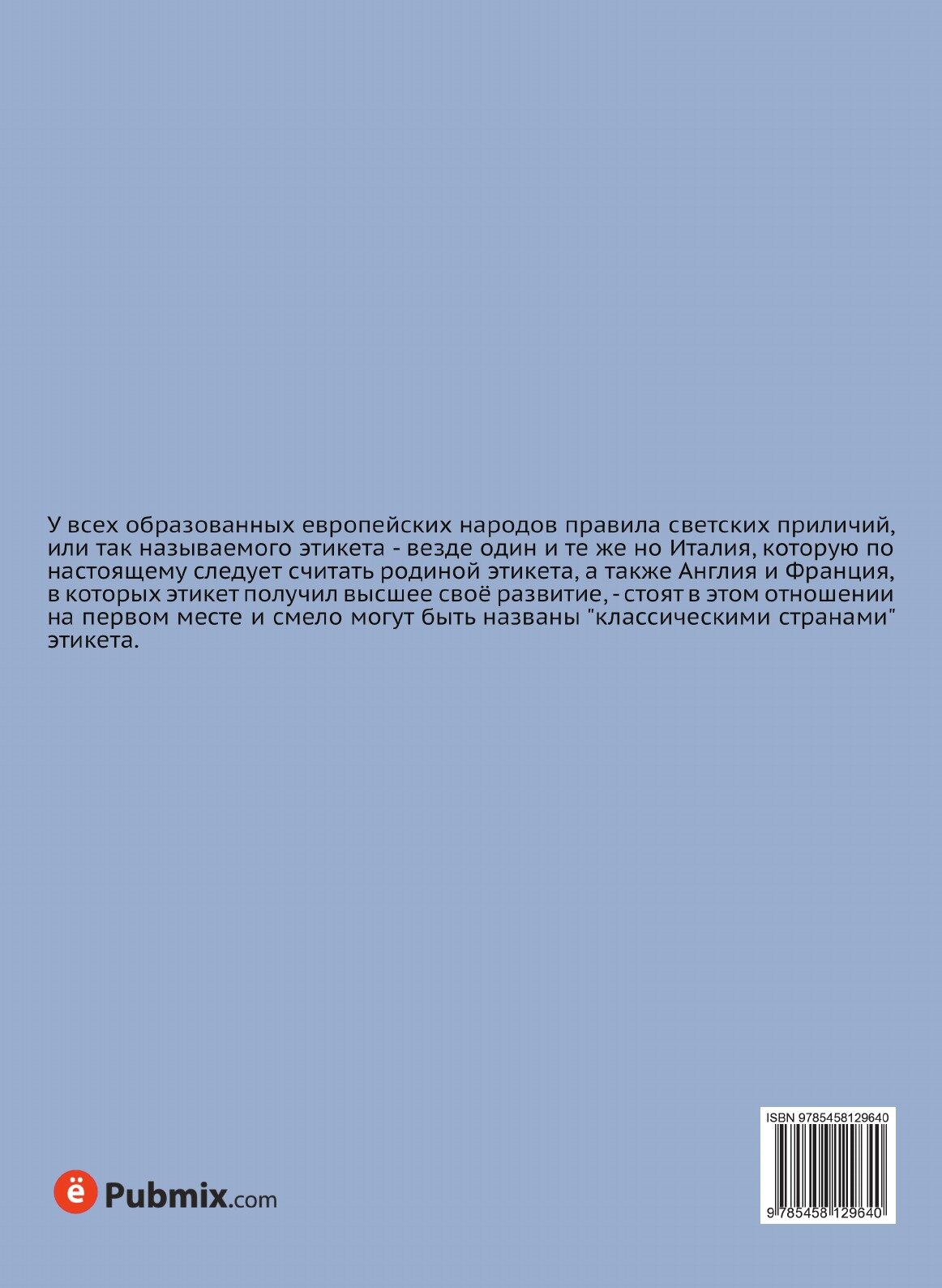 У всех образованных европейских народов правила светских приличий, или так называемого этикета - везде один и те же но Италия, которую по настоящему следует считать родиной этикета, а также Англия и Франция, в которых этикет получил высшее своё развитие, - стоят в этом отношении на первом месте и смело могут быть названы "классическими странами" этикета.