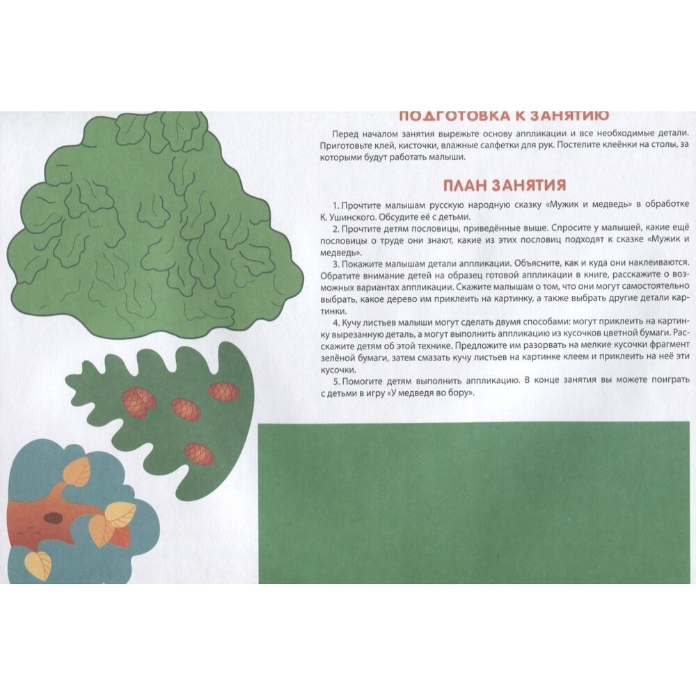 В книге - полный набор: и готовые картинки для вырезания и наклеивания, и подробная инструкция с планом занятия. Не нужно что-то придумывать самому - просто читаешь и играешь с малышом. После рабочего дня - самое то, чтобы и с мелким поиграть, и голову не ломать.