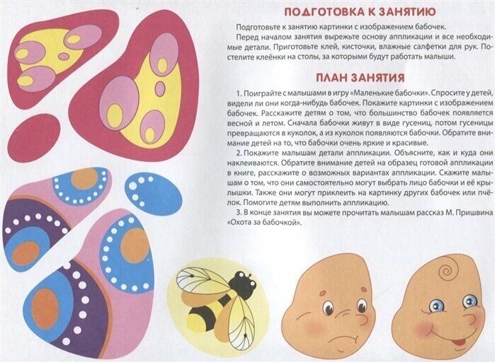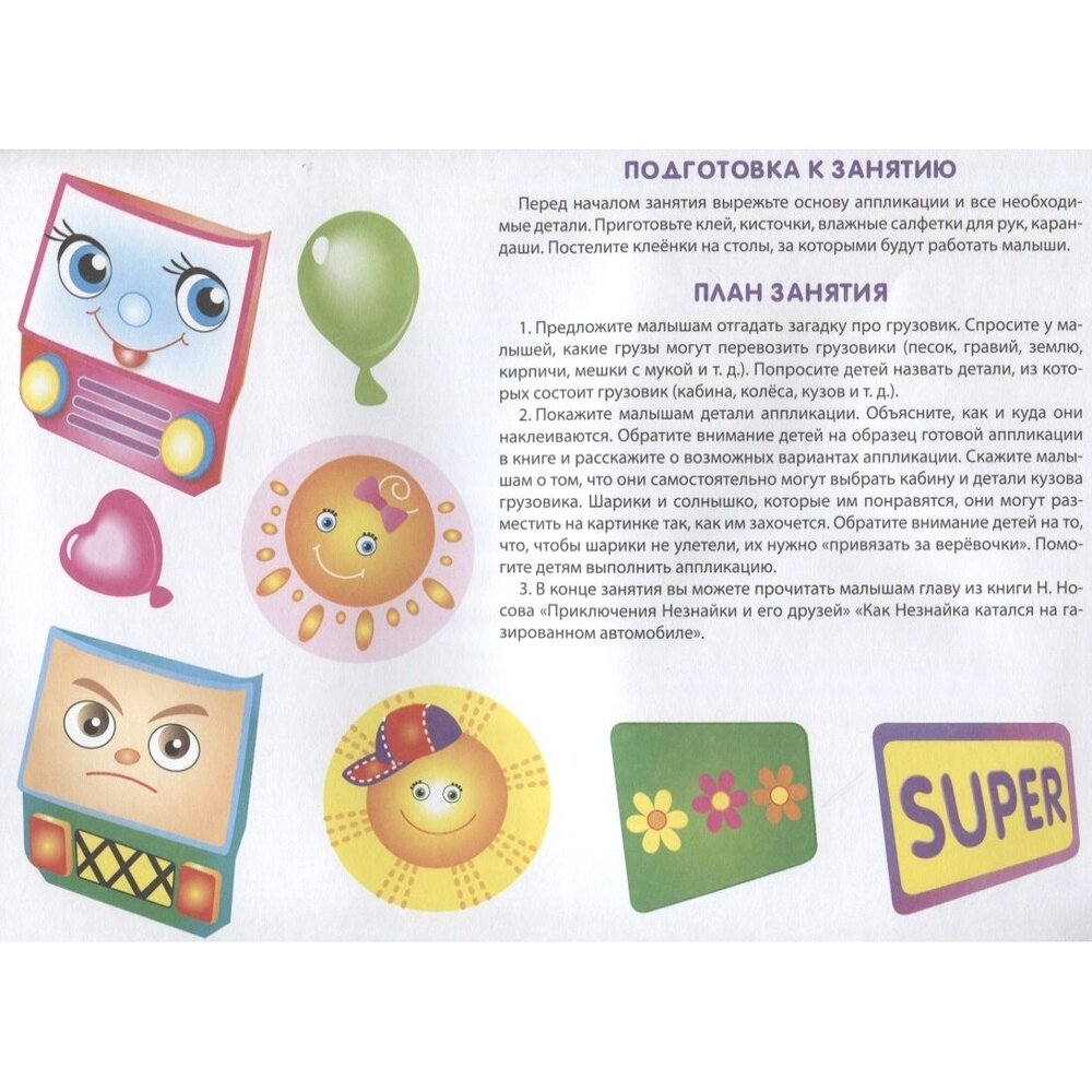 В книге - полный набор: и готовые картинки для вырезания и наклеивания, и подробная инструкция с планом занятия. Не нужно что-то придумывать самому - просто читаешь и играешь с малышом. После рабочего дня - самое то, чтобы и с мелким поиграть, и голову не ломать.