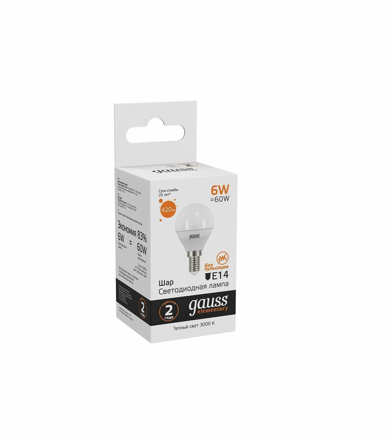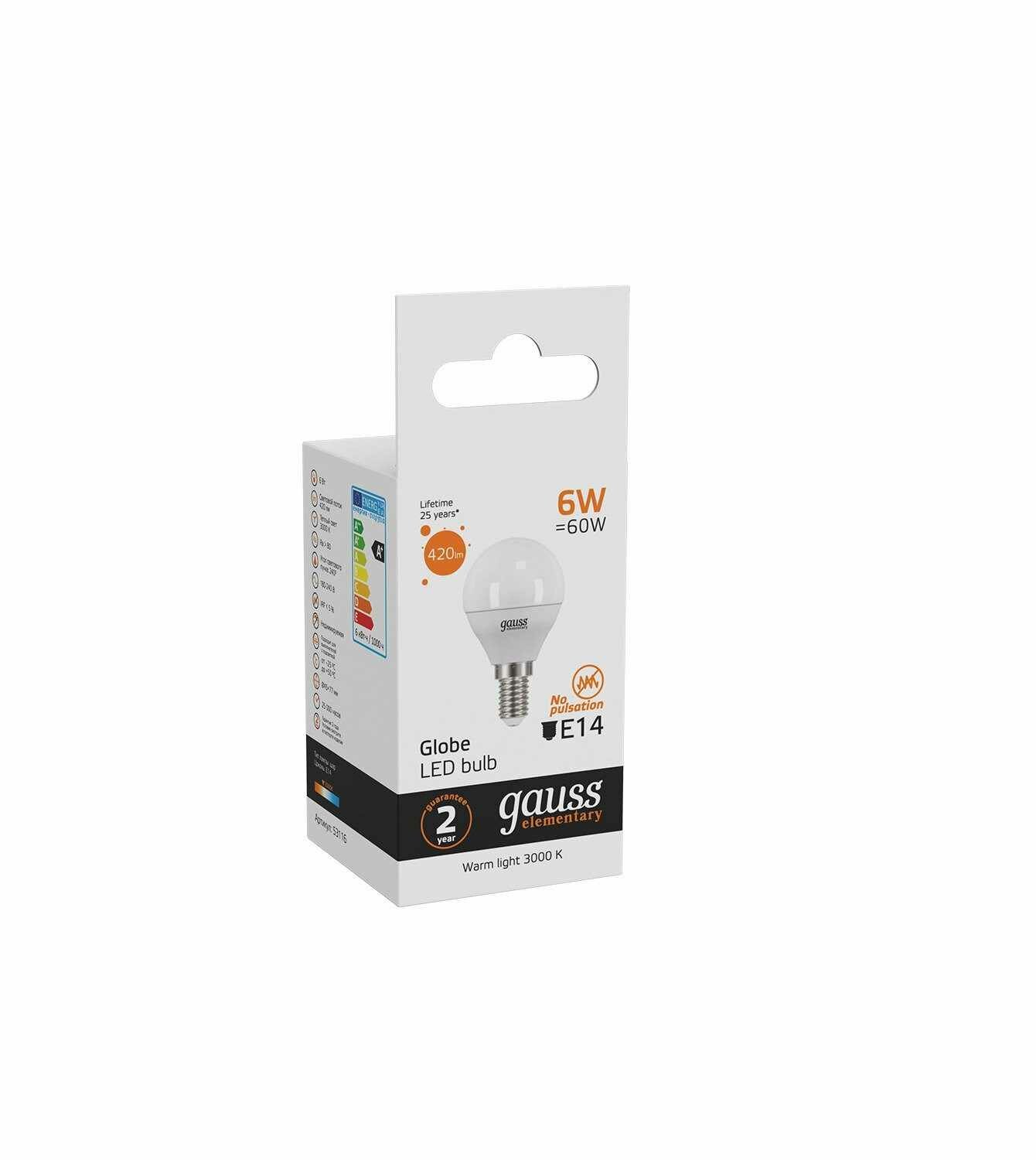 Продукция Gauss выполнена из экологически чистых материалов - не содержит ртути, свинца и фосфора, не выделяют токсичных веществ и не нуждаются в особой процедуре утилизации, Gauss мгновенно включаются, и имеет максимальную яркость с первой секунды - не требуют разогрева в отличие от КЛЛ. Gauss Elementary Globe имеет высокую цветопередачу, низкую температуру нагрева лампы, стабильную работу при перепаде температур. Срок службы светодиодной лампы Gauss до 35 раз дольше, чем у обычной лампы накаливания.