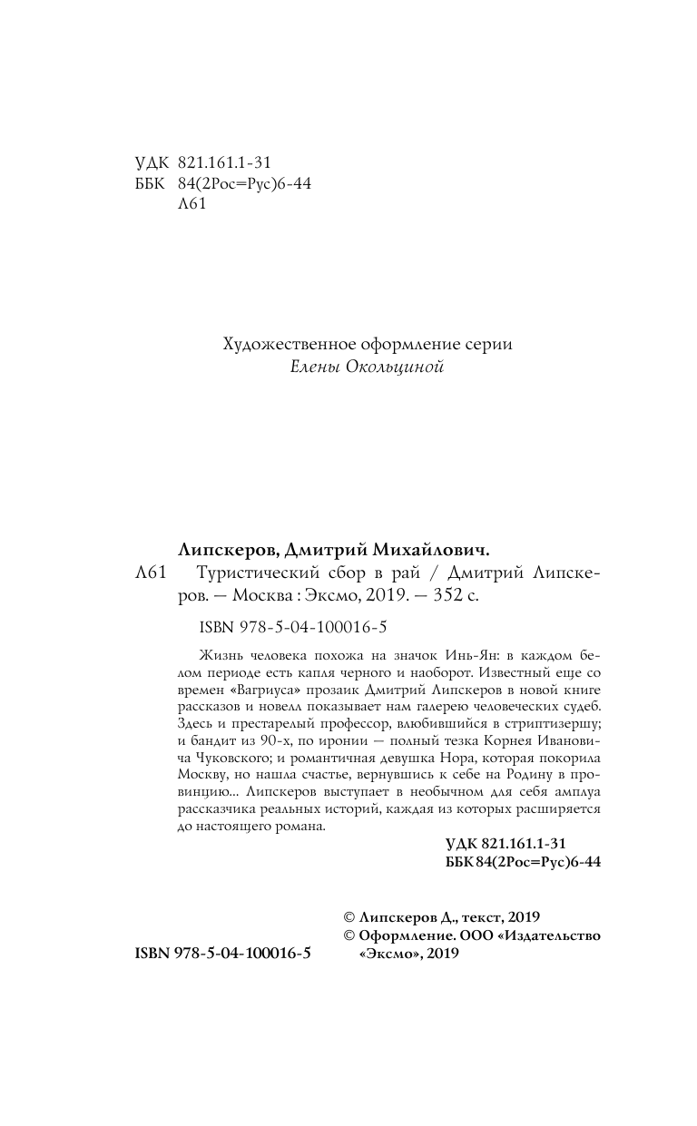 Книга: Туристический сбор в рай (Липскеров Дмитрий Михайлович); ООО "Издательство "Эксмо", 2019