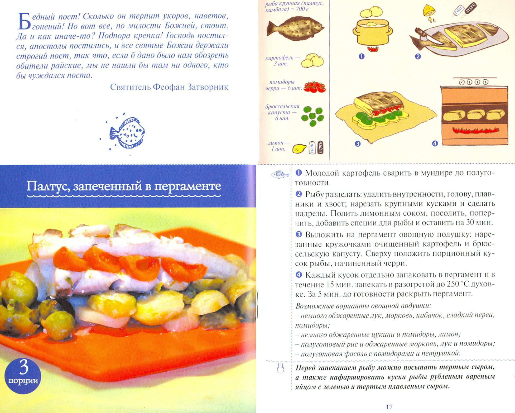 Книга построена следующим образом: сначала пошагово рассказывается, как приготовить блюдо для дней, когда церковным уставом разрешена рыба, а следом приводится рецепт для непостных дней.