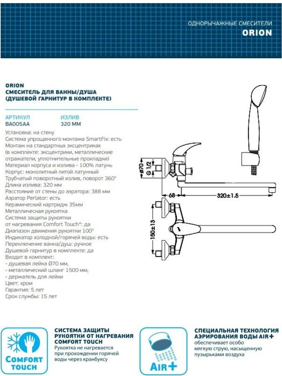 - 10 11 340183 Смеситель для ванны с душем Орион BA005AA