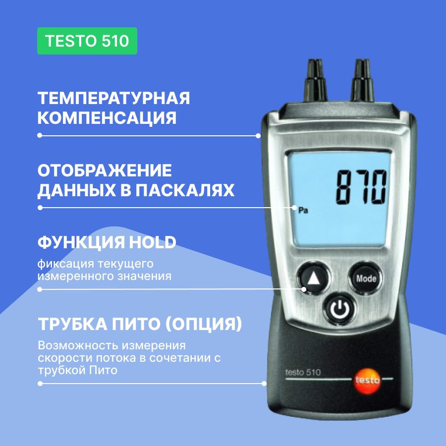 Карманный манометр Testo идеально подходит для измерения дифференциального давления с температурной компенсацией для более точных результатов замеров. Данные могут отображаться в Паскалях по всему измерительному диапазону. Магниты на задней части корпуса позволяют Вам работать, не держа прибор в руках, например, при настройке отопительных систем на газообразном топливе. Testo может измерять скорость потока с помощью трубки Пито. Манометр проводит компенсацию плотности воздуха для более точных результатов замеров.