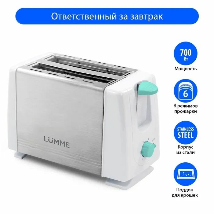 Тостер LUMME LU-1201 в корпусе из пищевой нержавеющей стали и термостойкого пластика, 6 режимами работы и плавной регулировкой мощности. 6 режимов обжаривания позволят получить хрустящие равномерно обжаренные тосты из любых сортов хлеба - от светлого пшеничного до темного ржаного. Тостер LUMME LU-1201 оснащен двумя отсеками для одновременного обжаривания двух кусочков хлеба, а съемный поддон для крошек существенно упрощает его очистку. Функция автоматического отключения тостера при перегреве исключает риск его повреждения, а материал корпуса – опасность обжечься. Тостер удачно впишется в дизайн любой кухни и наполнит ее великолепным ароматом обжаренного хлеба.