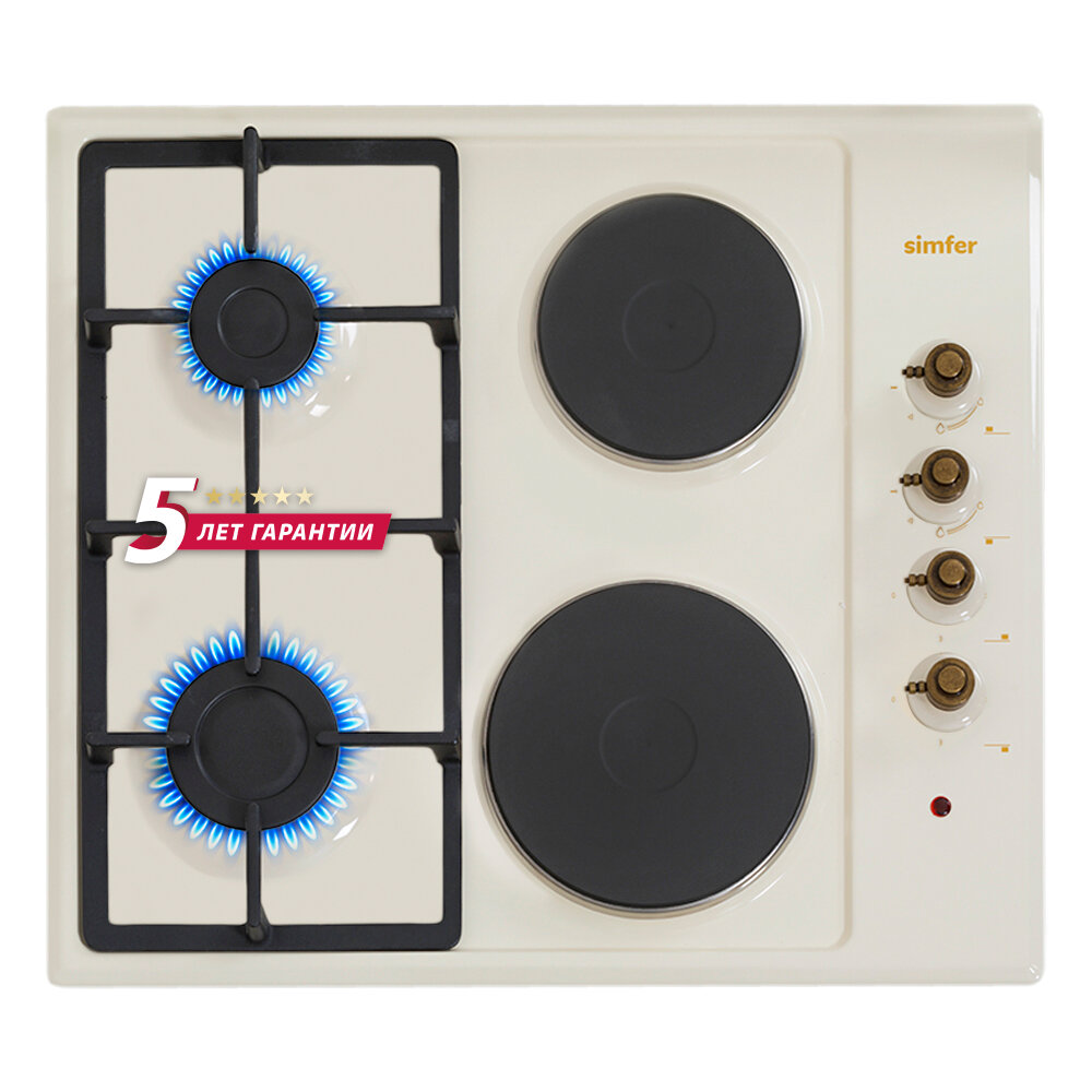 Комбинированная варочная панель Simfer , оснащенная двумя газовыми и двумя электрическими конфорками - настоящая находка для любящих эксперименты людей, так как комбинирование источников тепла предоставляет довольно обширные возможности для всех хозяек, которые вынуждены или любят много готовить. Благодаря небольшим размерам и лаконичному дизайну эта модель впишется в интерьер любой кухни. Материалом для рабочей поверхности модели служит эмалированная сталь, которая отличается долговечностью и устойчивостью к высоким температурам. Управление варочной панелью осуществляется посредством четырёх поворотных переключателей, в которые встроен электроподжиг, значительно упрощающий работу с панелью. Дополнительным достоинством варочной поверхности является наличие функции газ-контроль конфорок, отключающей подачу газа при затухании пламени. Комбинированная варочная панель Simfer стильный и функциональный прибор, который поможет вам готовить самые разнообразные блюда!