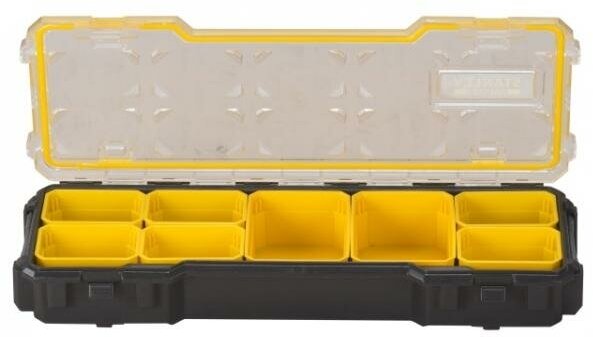 Мелкий органайзер Stanley 13 FATMAX FMST1-75781 предназначен для хранения и транспортировки мелких деталей. Защелки защищают детали от рассыпания. Восемь отделений разного размера позволяют укладывать всякого рода оснастку. Можно скреплять вместе до девяти органайзеров FatMax. По периметру предусмотрено водозащитное уплотнение - класс пылевлагозащиты IP-53. Это обеспечивает долгий срок службы изделия.