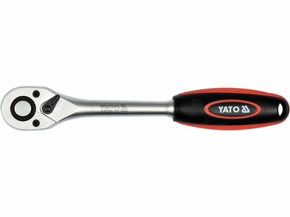 Прямая трещотка с пластмассовой ручкой YATO 72 зуб.1/2"265мм ускоряет затягивание или откручивание крепежа. Также способствует быстрой работе в ограниченном пространстве.Есть удобная рукоять, которая способствует работе с малым усилием. Трещотка обеспечивает поворот даже при небольшом углу затяжки.