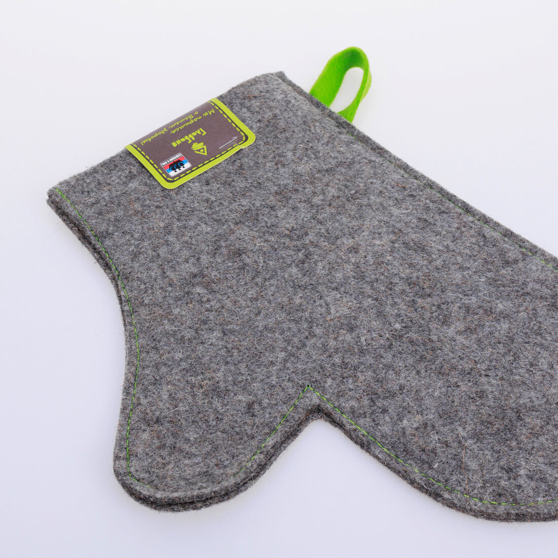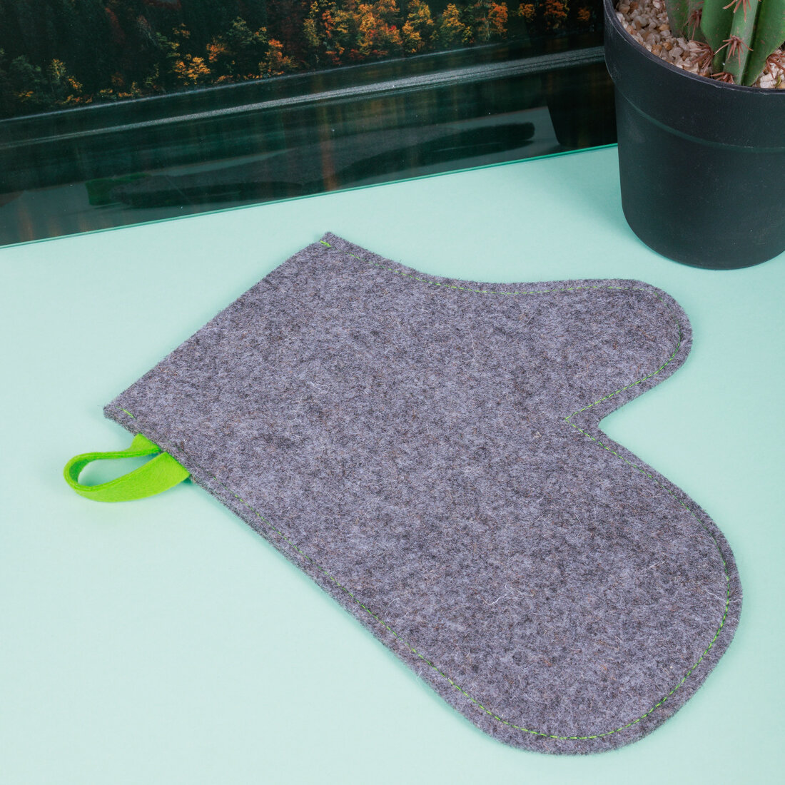 Классическая рукавица для бани из качественного плотного войлока. Защитит ладони от высоких температур, горячих предметов и возможных повреждений, которые может оставить ручка веника.