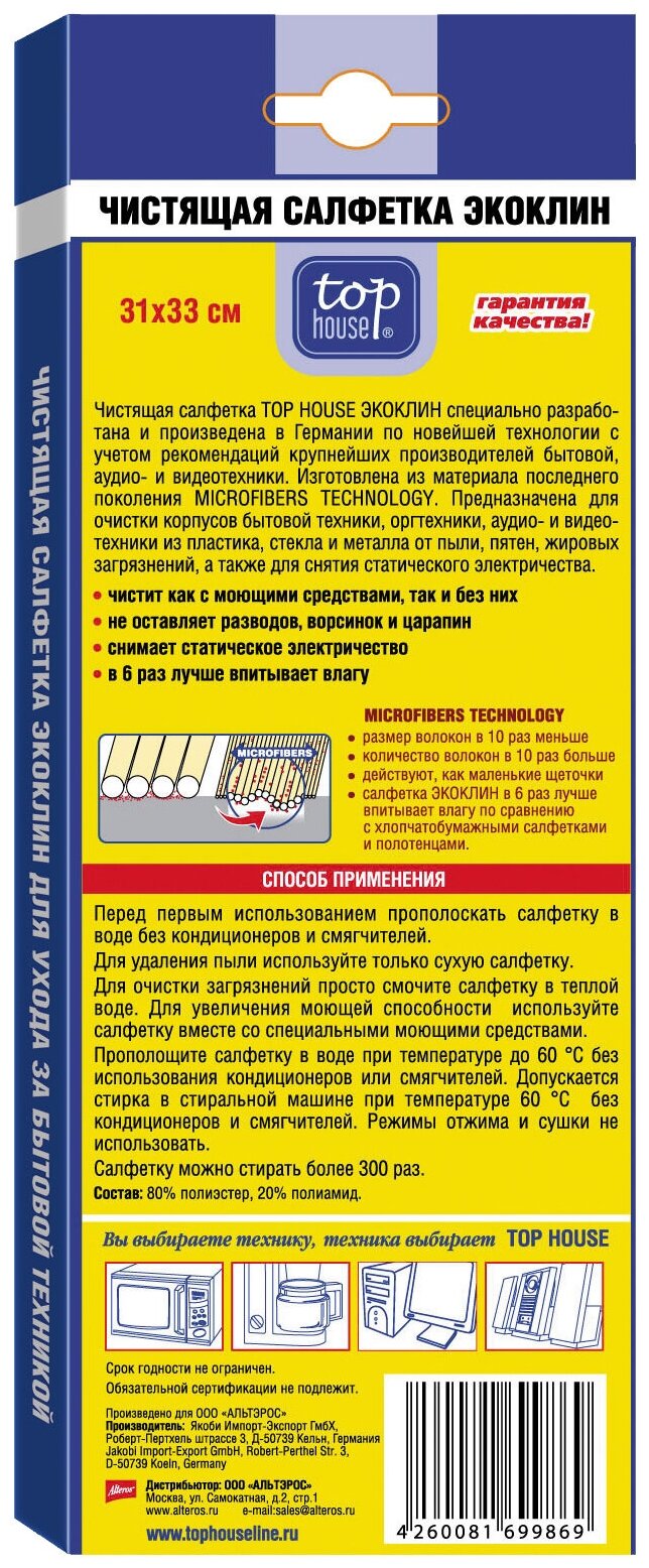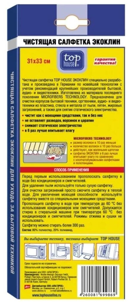 Салфетка для ухода за бытовой техникой Top House используется совместно со средствами чистки. В некоторых случаях можно обойтись и вовсе без них. Она намного качественнее и лучше осуществляет впитывание влаги. Салфетка не оставляет за собой никаких царапин и разводов, а также ворсинок. Качество и состав волокон в несколько превосходит своих аналогов. Пользоваться ею можно неоднократно. Доступная цена делает их приобретение выгодным.