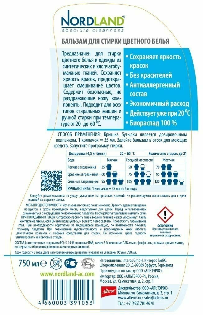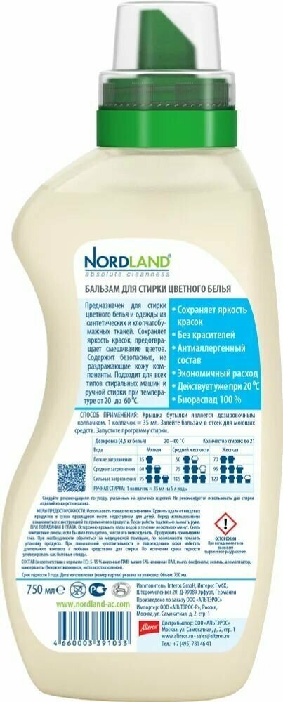 Немецкая фирма Nordland, производящая различные средства бытовой химии представлена на нашем рынке не так давно, однако уже успела полюбиться многим хозяйкам. Nordland Nordland предназначено специально для стирки шелковых и шерстяных вещей и предусматривается как для использования для машинной стирки при температуре воды от 20 до 40 градусов, так и для ручной стирки. Удобная упаковка в виде прочной и качественной пластиковой бутылки с дозатором позволит удобно хранить жидкость и правильно рассчитывать необходимые для стирки пропорции. Средство полностью безвредно для человека. Среди компонентов, входящих в его состав нет вредных веществ, способных вызвать аллергю и раздражение кожи. Белье, которое стиралось с применением бальзама Nordland будет полностью сохранять свою цветовую гамму, фактуру и форму, а так же будет иметь приятный и свежий аромат.
