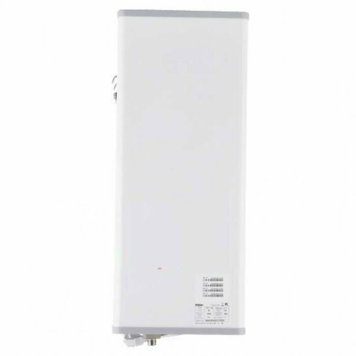 Водонагреватель Haier ES 80V F1 накопительного типа оформлен в белой расцветке, поэтому гармонично впишется в интерьер ванной комнаты. Представленная модель устанавливается на стену вертикально, вода подводится снизу. Габариты устройства составляют 53х104.6х30.5 см. Вода собирается в плоском баке объемом 80 л, эмалевое покрытие предотвращает образование внутри его ржавчины.