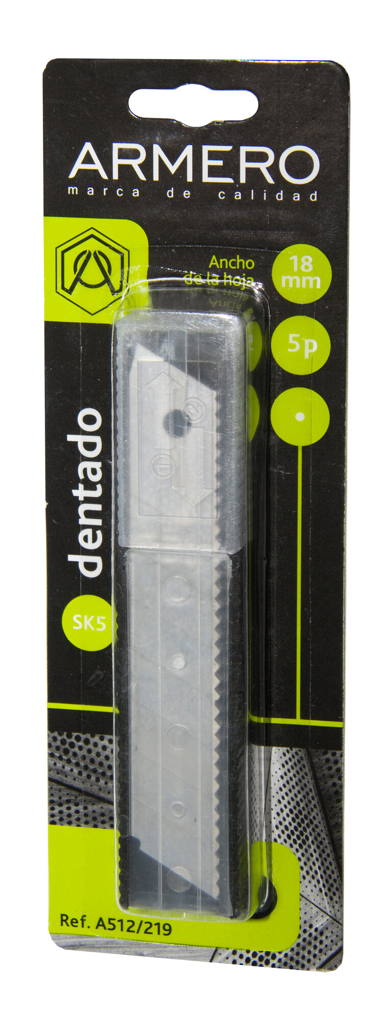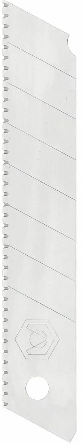 Лезвие для технического ножа сегментное ARMERO A512/219 с шириной лезвия 18 мм с толщиной лезвия 0.5 мм из высококачественной стали SK5, с зубчатой заточкой лезвия, из 7 отделяемых сегментов (8 режущих кромок) в упаковке из 5 штук.Лезвие применяется для резки бумаги, картона, обоев, линолеума и других аналогичных материалов с помощью строительного ножа.Особенности и преимущества:Ширина лезвия - 18 мм.Толщина лезвия – 0.5 мм.Сегментное лезвие из высококачественной стали SK5.Зубчатая заточка лезвия.Лезвия расположены в пластиковом диспенсере, для удобства хранения