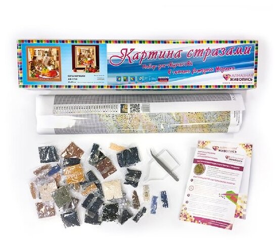 | Комплектация | холст с изображением-схемой, акриловые стразы, пинцет, лоток для страз, подробная инструкция |