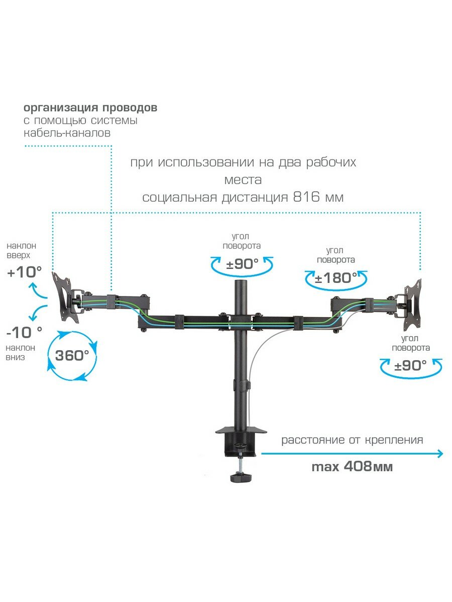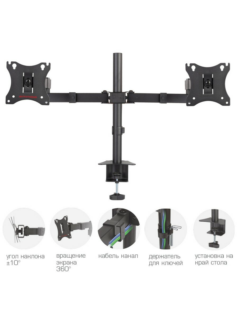 | Дополнительно | Универсальное настольное крепление для 2-х мониторов. , Надежная стальная конструкция- макс. нагрузка 2x7 кг. , Монитор на кронштейне можно: вращать на ±45° в горизонтальной плоскости, наклонять вверх и вниз, и поворачивать влево и вправо. , Регулируемое по высоте крепление. , Кабель-канал. |