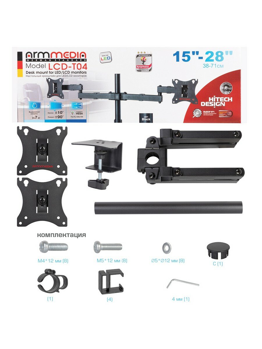 Модель Arm Media LCD-T04 представляет собой кронштейн, с помощью которого вы сможете закрепить сразу два VESA-совместимых монитора на стене. Подобного хода зачастую требует интерьер, а уж про аудитории в учебных заведениях и торговые центры и вовсе говорить не приходится.