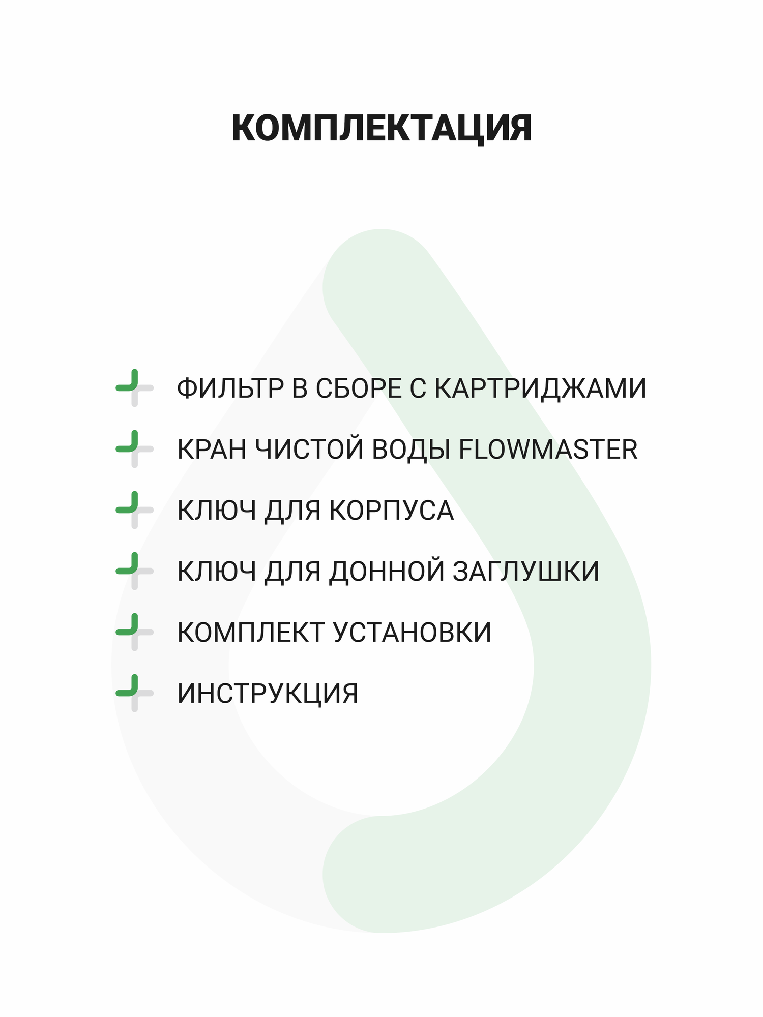 | ВКоробке | Фильтр в сборе - 1 шт. Ключ для корпуса - 1 шт. Кран для чистой воды с комплектом подключения - 1 шт. Трубка соединительная 1/4 - 1 шт. Тройник-адаптер с краном - 1 шт. Инструкция - 1 шт. |