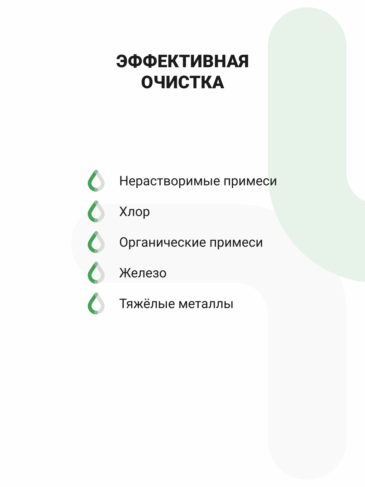 | Очистка от | органических загрязнителей,свободного хлора,солей жесткости,бактерий и вирусов,тяжелых металлов,железа,ржавчины,осадка,песка |