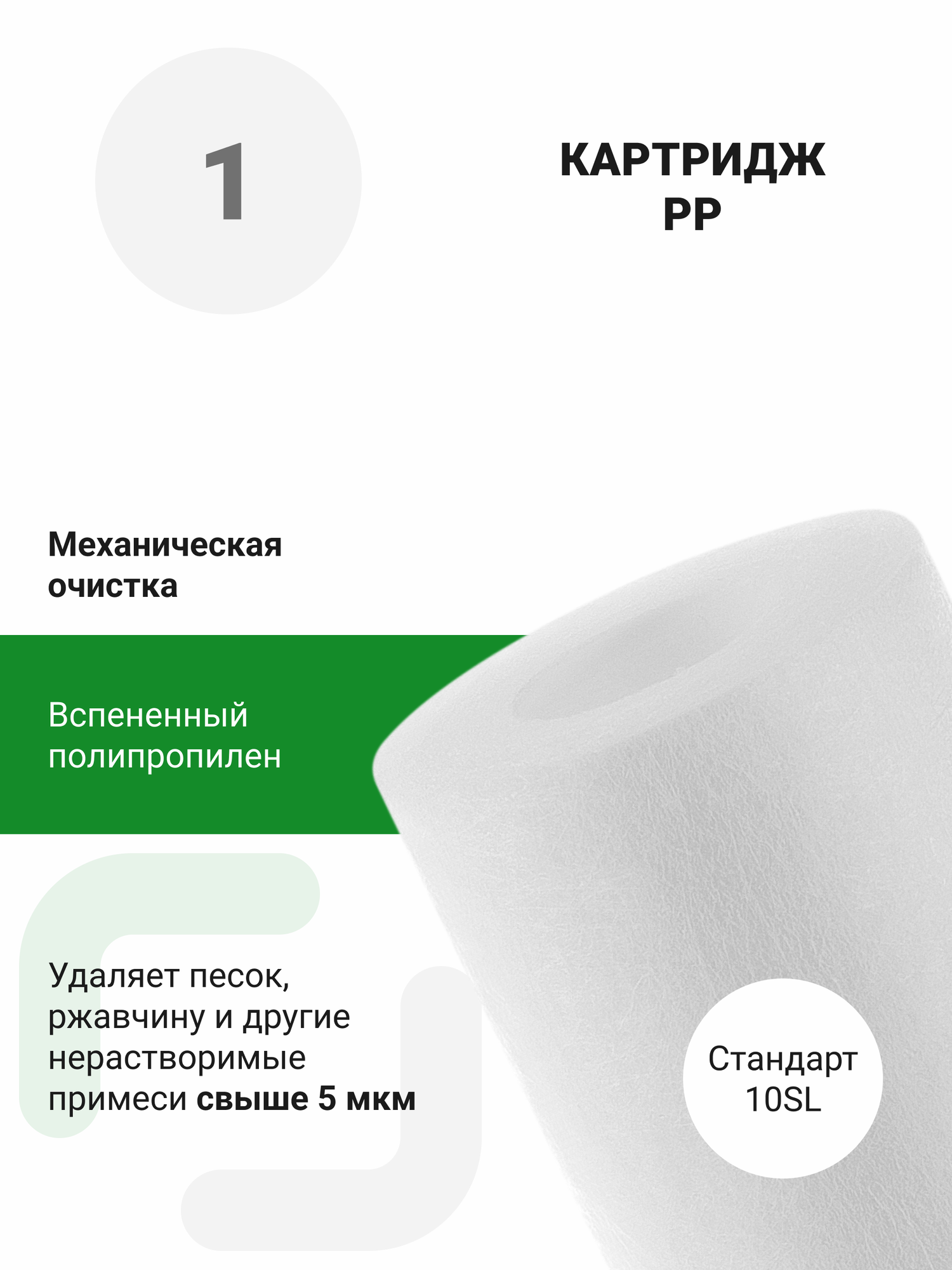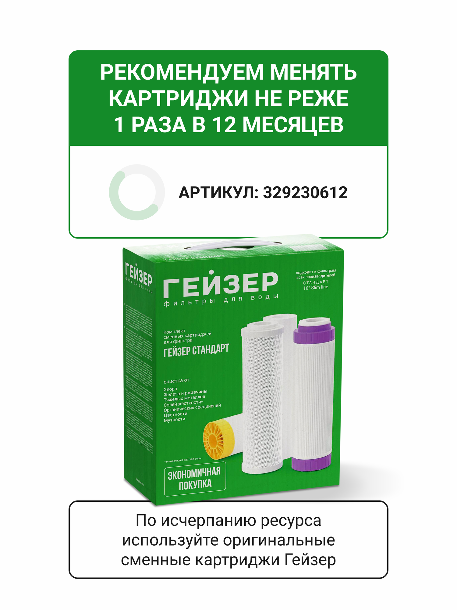 Фильтр Гейзер Стандарт специально разработан для регионов с мягкой водой (низкий уровень минерализации). Фильтр Гейзер Стандарт для мягкой воды состоит из 3 картриджей: 1. осадочный картридж Пфм – удаляет нерастворимые частицы, размером до 5 мкм (ржавчина, взвеси) 2. Баф – универсальный картридж для удаления хлора, органических примесей, железа и тяжелых металлов. Содержит серебро. 3.