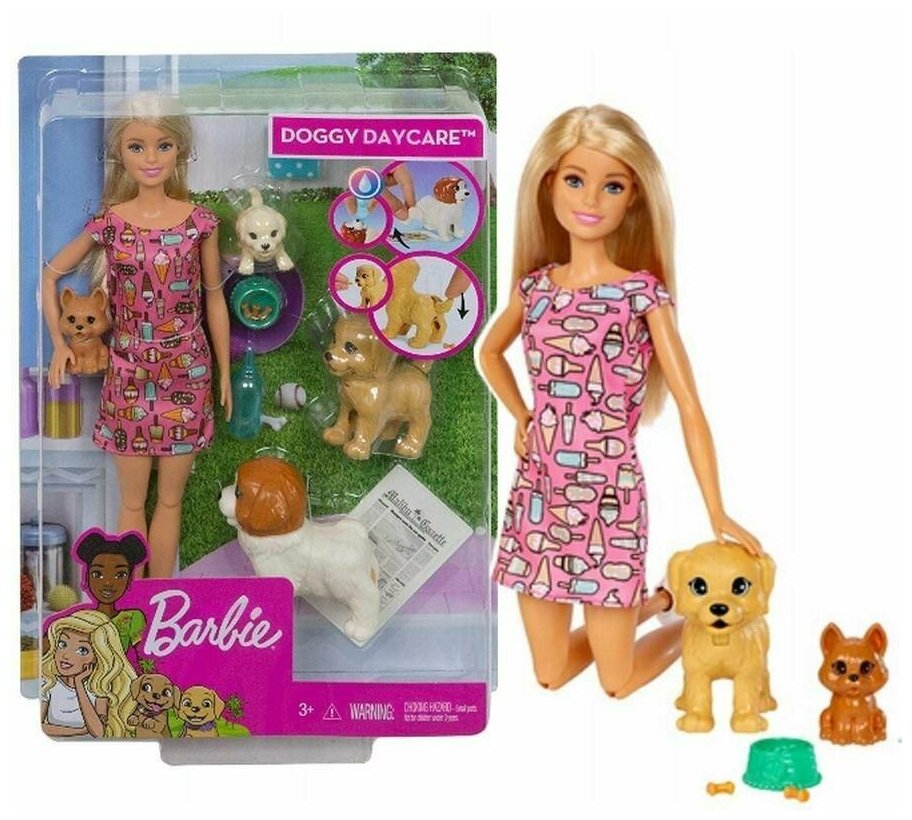 Куколка с длинными светлыми волосами одета в розовое платье с принтами мороженого. У Барби есть четверо симпатичных щенков, с которыми она проводит все свое время. Их можно кормить из миски. Самого большого щенка с коричневой мордочкой и белой шерсткой на туловище можно поить из бутылочки, а потом собачка писает на газету. Нужно приподнять ее заднюю лапку, и щенок сходит в туалет.
