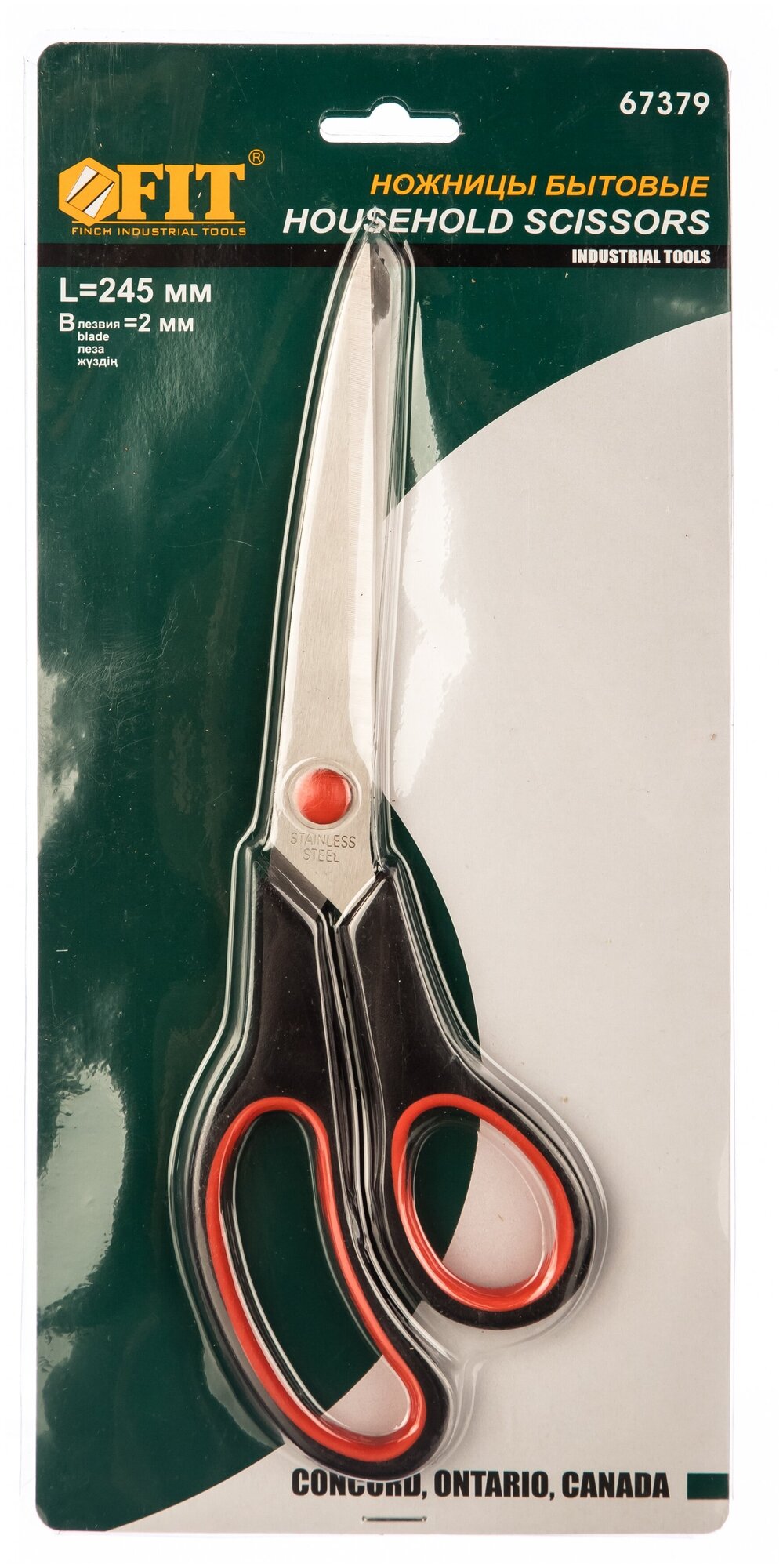 Бытовые ножницы FIT IT лезвие 2мм, пластик. ручка 245мм используются для бытовых целей и мелкого ремонта. Толщина лезвия составляет 2 мм. Лезвие изготовлено из нержавеющей стали. Ручки выполнены из пластика и оснащены мягкими вставками.