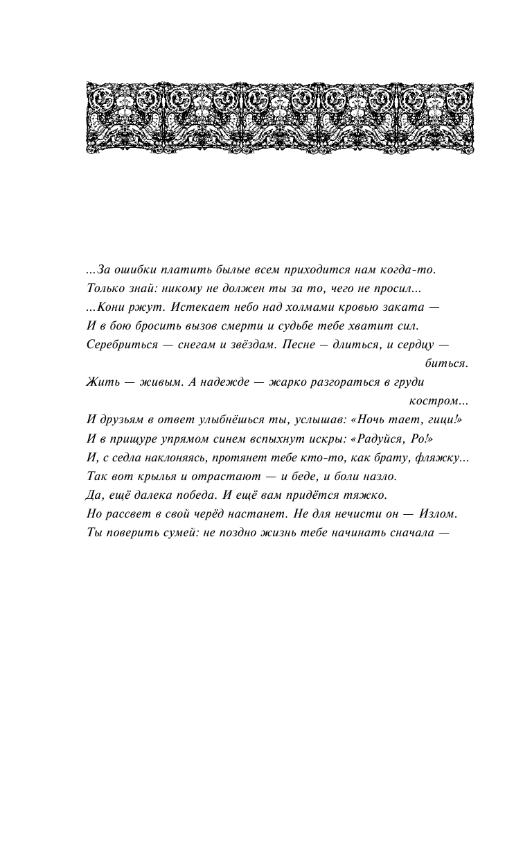 Стихают пушки, вспыхивают костры. Маршал Алва смеется, бригадир Придд улыбается. Робер Эпинэ счастлив впервые за много лет, Марсель Валме ему почти завидует. Руперт фок Фельсенбург получает назад кошку и думает о любви, Арно Савиньяк умудряется отыскать чужую пропажу и еще кое-что. Мэллит смотрит на золотой цветок, а Селина - на кольцо со странным знаком. Еще зима, но день уже растет, а ночь тает…
