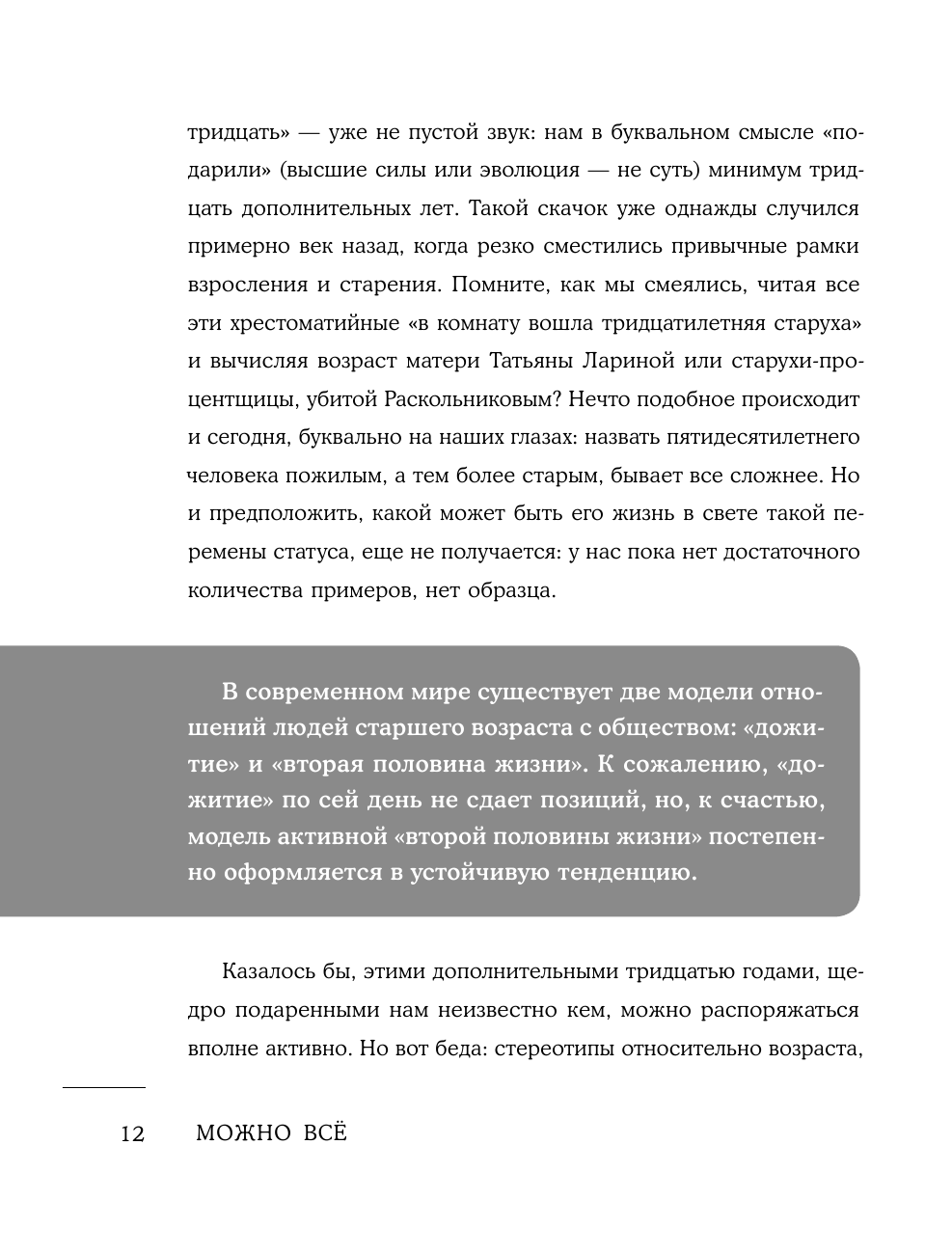После прочтения книги, моя мама полностью пересмотрела отношение к возрасту, перестала придавать ему такую важность, а тем более , к счастью, перестала косить под подростков :) Она как будто расцвела и стала гораздо привлекательней, мудрей и стала даже в какой-то степени наслаждаться своим возрастом. Сейчас она очень вдохновлена, увлечена и я искренее за нее радуюсь!