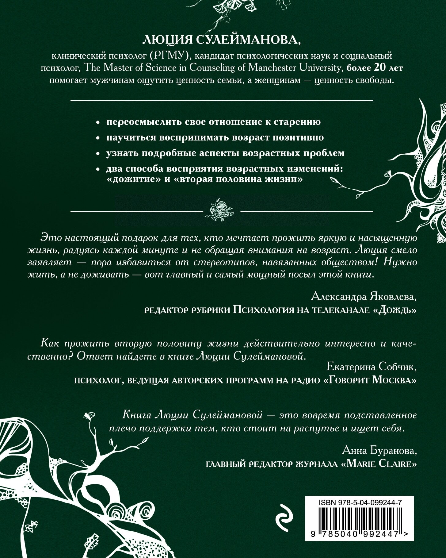 В этой книге кандидат психологических наук Люция Сулейманова дает ответы на вопросы, которые волнуют всех женщин, переступивших определенный возрастной рубеж. Автор подробно рассматривает все аспекты возрастных проблем на примере двух взглядов и двух способов восприятия возрастных изменений: "дожитие" и "вторая половина жизни". Какие стереотипы мешают женщинам наслаждаться жизнью в старшем возрасте? Как поменять эти стереотипы?