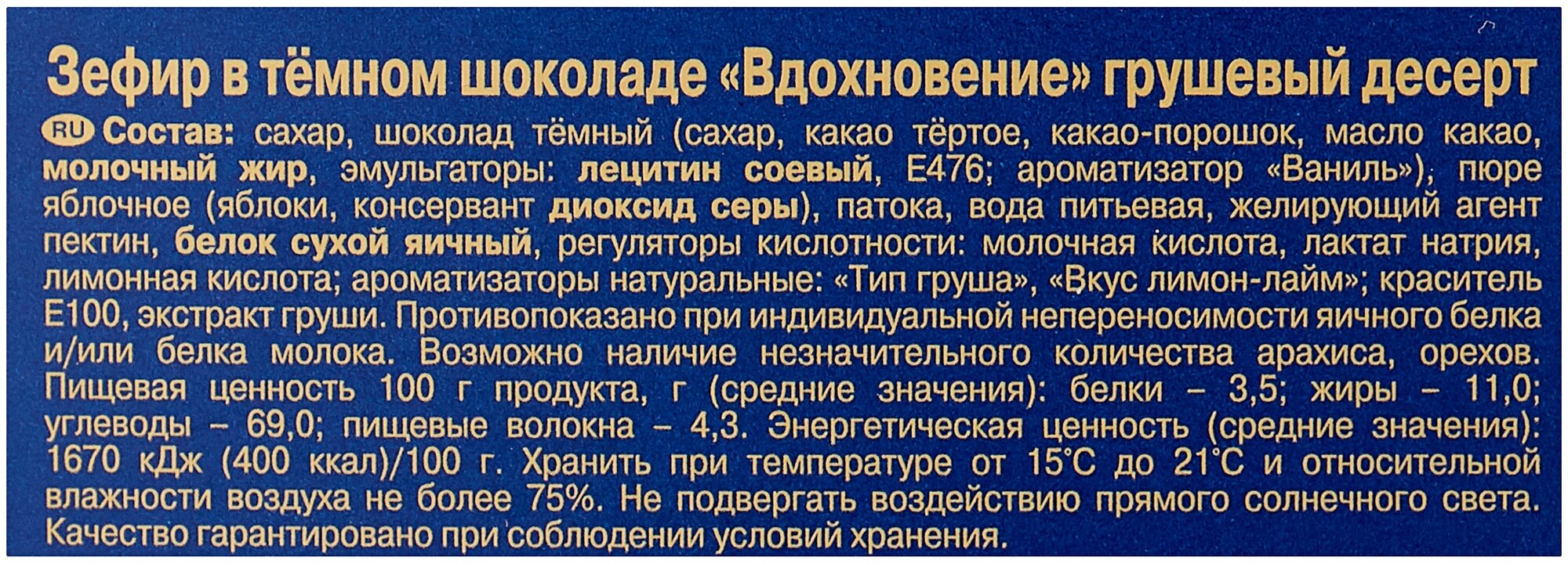| Состав | Сахар, шоколад темный (сахар, какао тертое, какао-порошок, масло какао, молочный жир, эмульгаторы: лецитин соевый, Е476, ароматизатор "Ваниль"), пюре яблочное (яблоки, консервант - диоксид серы), патока, вода питьевая, желирующий агент - пектин, белок сухой яичный, регуляторы кислотности: молочная кислота, лактат натрия, лимонная кислота, ароматизаторы натуральные "Тип Груша", "Вкус лимон-лайм", краситель Е100, экстракт груши |