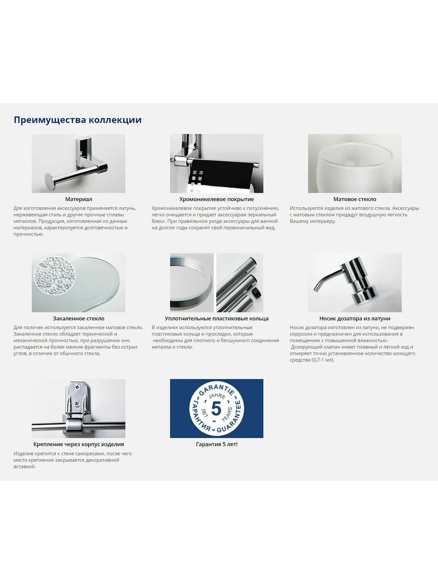 , Германия Характеристики серии Leine K-5000: - Корпус произведен из латуни. Характеризуется долговечностью и прочностью. - Хромоникелевое покрытие устойчивое к потускнению, легко очищается и придает аксессуарам зеркальный блеск. - Для полочек используется закаленное матовое стекло. Закаленное стекло обладает термической и механической прочностью, при разрушении оно распадается на более мелкие фрагменты без острых углов, в отличие от обычного стекла.
