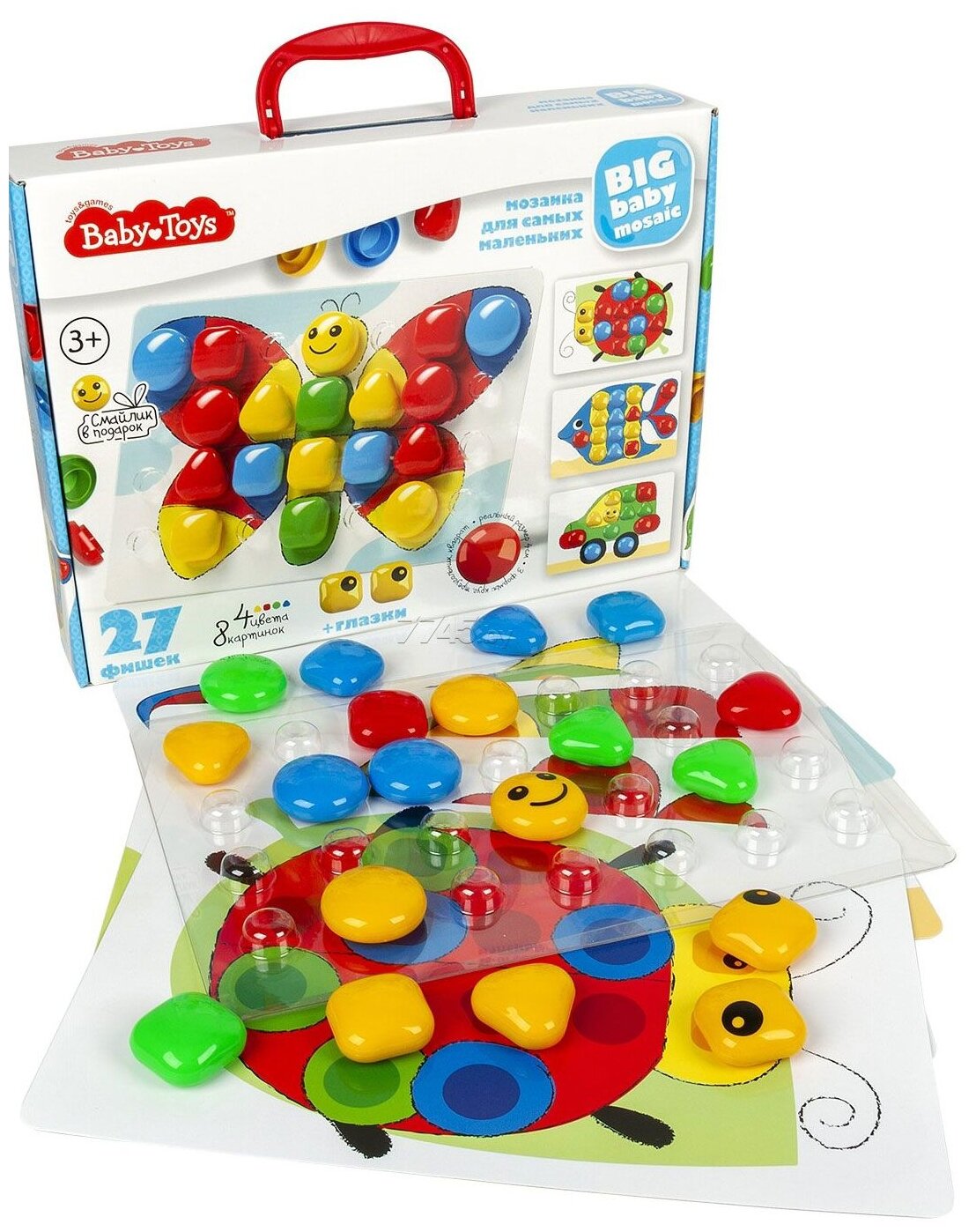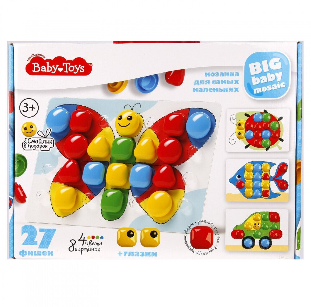 | Описание | Мозаика 27 элементов, четырех цветов серии Baby Toys - это увлекательная обучающая и развивающая игра для самых маленьких. Абсолютно безопасна для детей, крупные фишки размером 40 мм невозможно проглотить. Яркие картинки заинтересуют вашего непоседу. В процессе игры ребенок освоит цвета, основные формы. Игра разовьет координацию движений и мелкую моторику. Мозаика рассчитана на детей начиная с 3 летнего возраста.,Как играть:,1. Вставьте картинку в плату.,2. Подберите фишку по цвету и форме.,3. Поставьте фишку на плату.,Примеры складывания мозаики вы найдете на обратной стороне коробки.,Состав:,- Плата на 28 фишек (размер 348х233 мм) - 1 шт.,- Картинки - 8 шт на 4 листах (размер 345х230 мм).,- Фишки 40 мм, трех форм (круг, квадрат, треугольник), четырех цветов - 27 шт (из них |