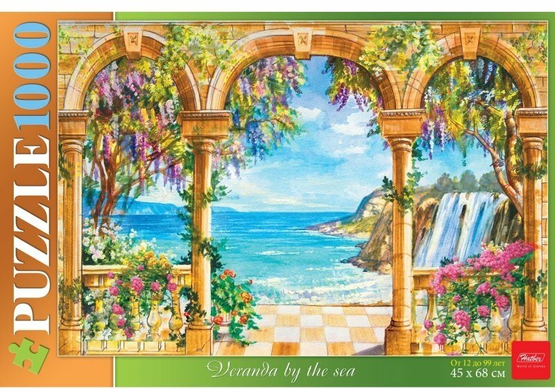 Пазл от бренда Hatber представляет собой красочную картину под названием "Веранда у моря". Для того, чтобы придать пазлу законченный вид, ребенку нужно будет соединить вместе 1000 элементов. На картине с веранды открывается потрясающий вид берег острова, где водопад бурным потоком сбрасывается в океанские воды.