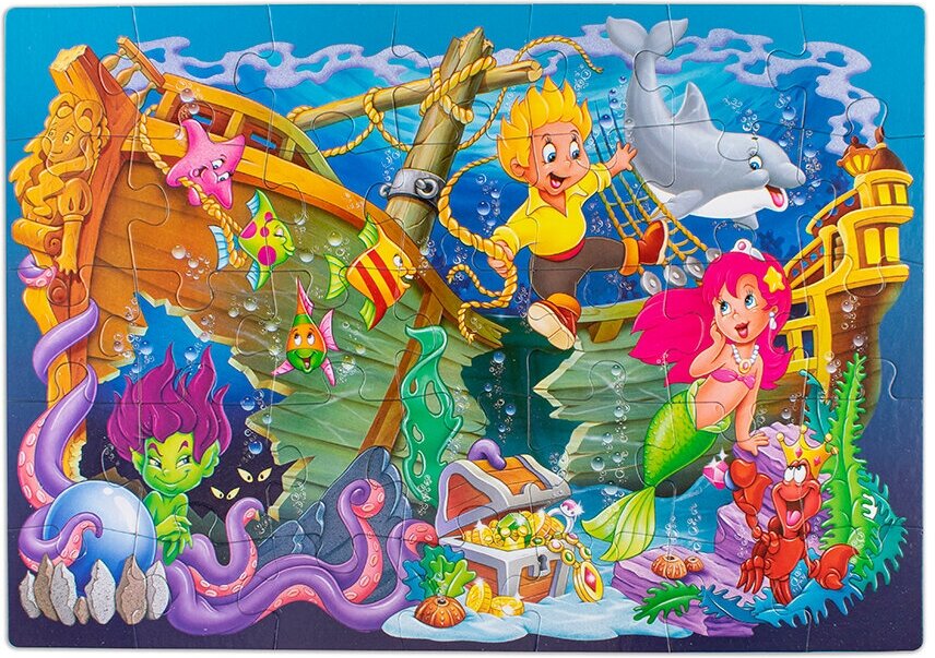 Пазл «Русалочка» состоит из 35 деталей и входит в серию «Любимые сказки». Сама Русалочка, прекрасный принц, краб Себастьян, дельфины, рыбки и даже морская ведьма — на картинке мы видим всех главных героев этой волшебной истории.Характеристики пазла:- стандартные детали пазла (4,5 × 4,6 см);- размер собранного изображения - 23 × 33 см;- качественное яркое изображение;- материал – картон;- экологически чистые, нетоксичные материалы (компания Step Puzzle гарантирует высокое качество пазла и точность подгонки).Пазл подходит для детей от 3 лет.Прочитайте вместе с детьми сказку, а потом соберите вместе пазл «Русалочка». Кто знает, может быть, вы придумаете своё продолжение истории?