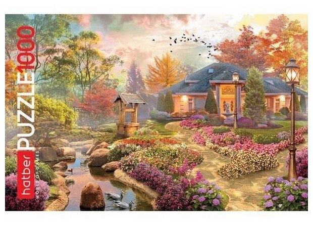 Пазл от бренда Hatber, состоящий из 1000 картонных элементов, представляет собой картину под названием "Любимый сад". На ней изображен небольшой загородный дом, вокруг которого раскинулся величественный лес. Прилежащая к дому территория включает в себя пестрые цветочные клумбы и небольшой пруд, в котором плавают утки.