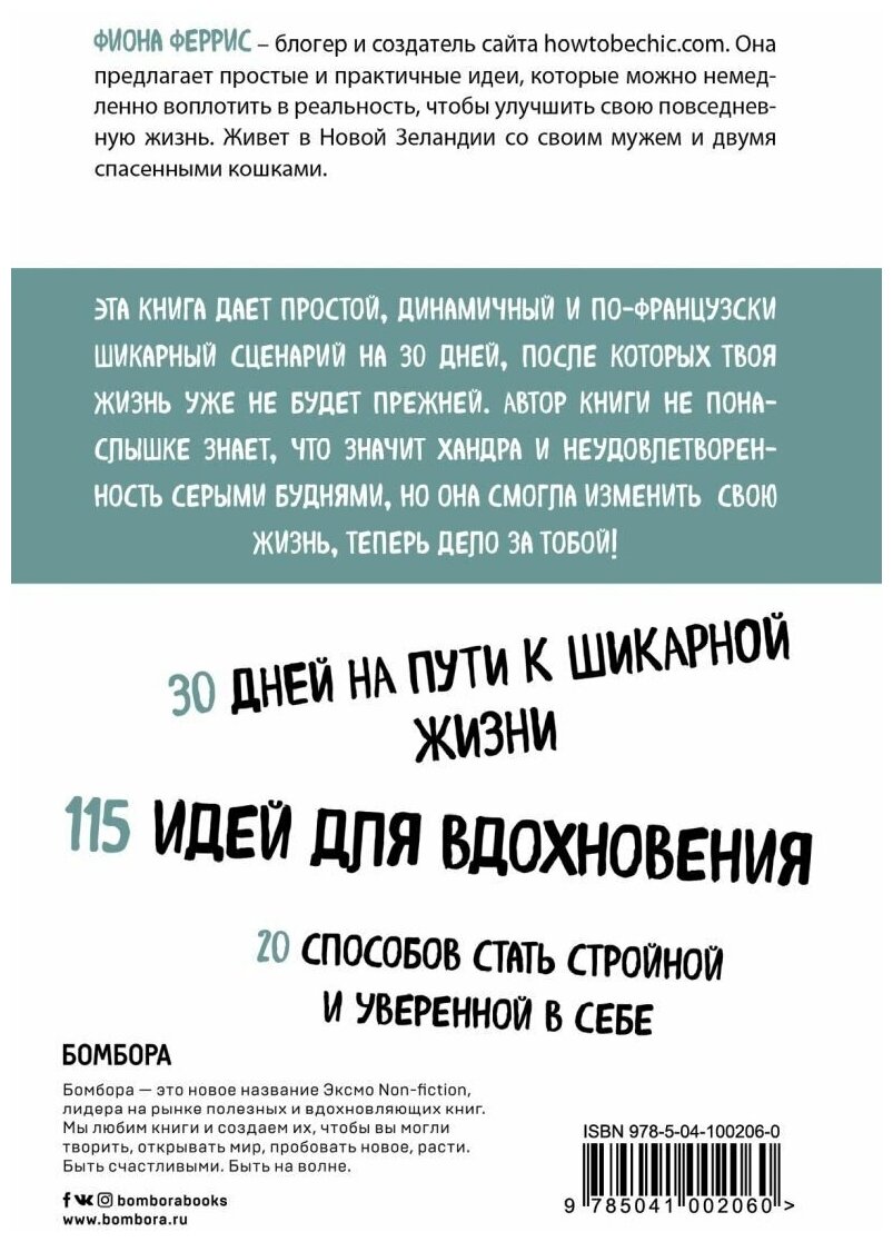 "30 шикарных дней" – это не разовая поездка к океану, а возможность воспринимать привычные будни так, будто вы отдыхаете ежедневно. Автор Фиона Феррис, увлеченная идеей счастливой жизни, посвятила более 20-ти лет исследованию методов получения удовольствия изо дня в день, не тратя на это больших денег. Книга учит простому, но важному: как создать атмосферу счастья и заряжать ею людей, быть сильной в своей женственности, изменить отношение к быту, превратить приемы пищи в красивый ритуал и получать удовольствие от того, как вы выглядите и где живете. Эта книга-марафон легко и ненавязчиво меняет взгляд на обыденные вещи, рассказывает, как справиться с рутиной сквозь призму вдохновения и творческой энергии.